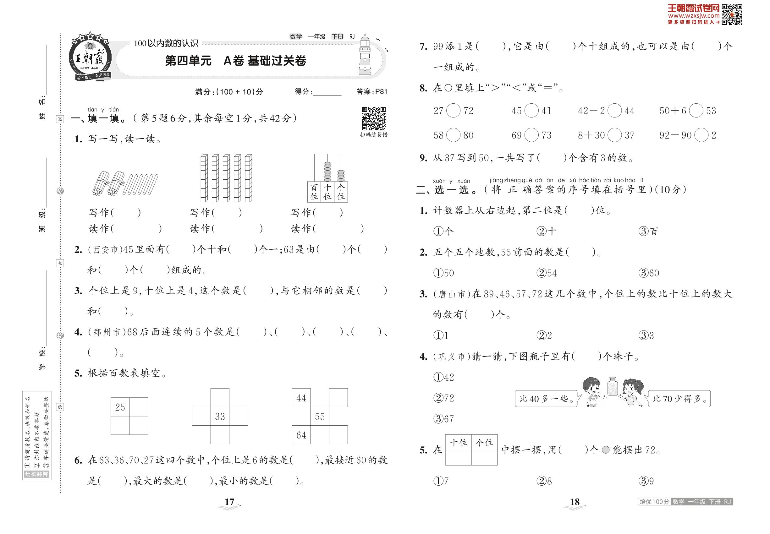 一年级数学人教版下册单元卷