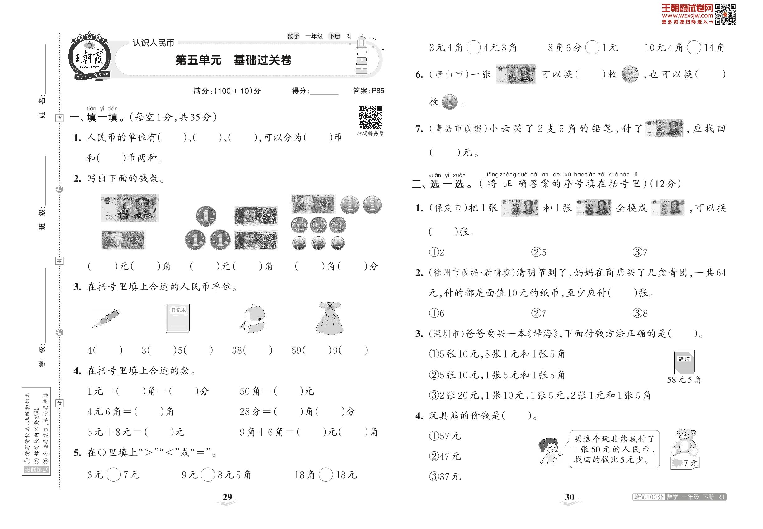 一年级数学人教版下册单元卷