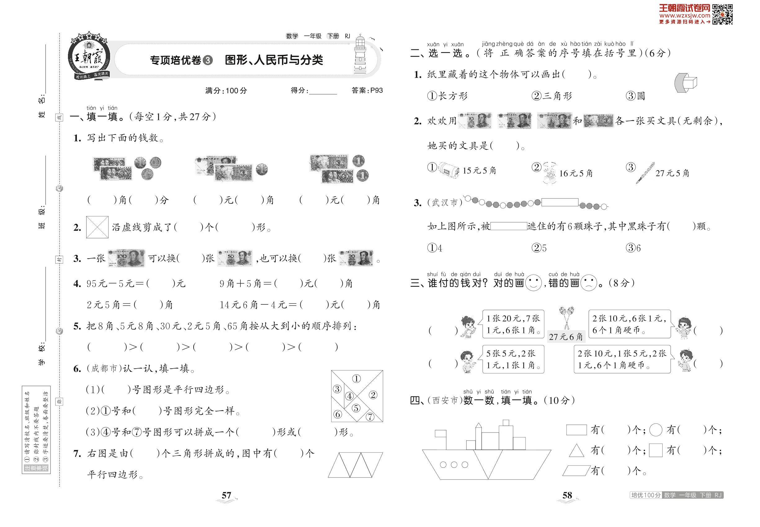 2023下册一年级数学人教版 专项培优卷3 图形、人民币与分类