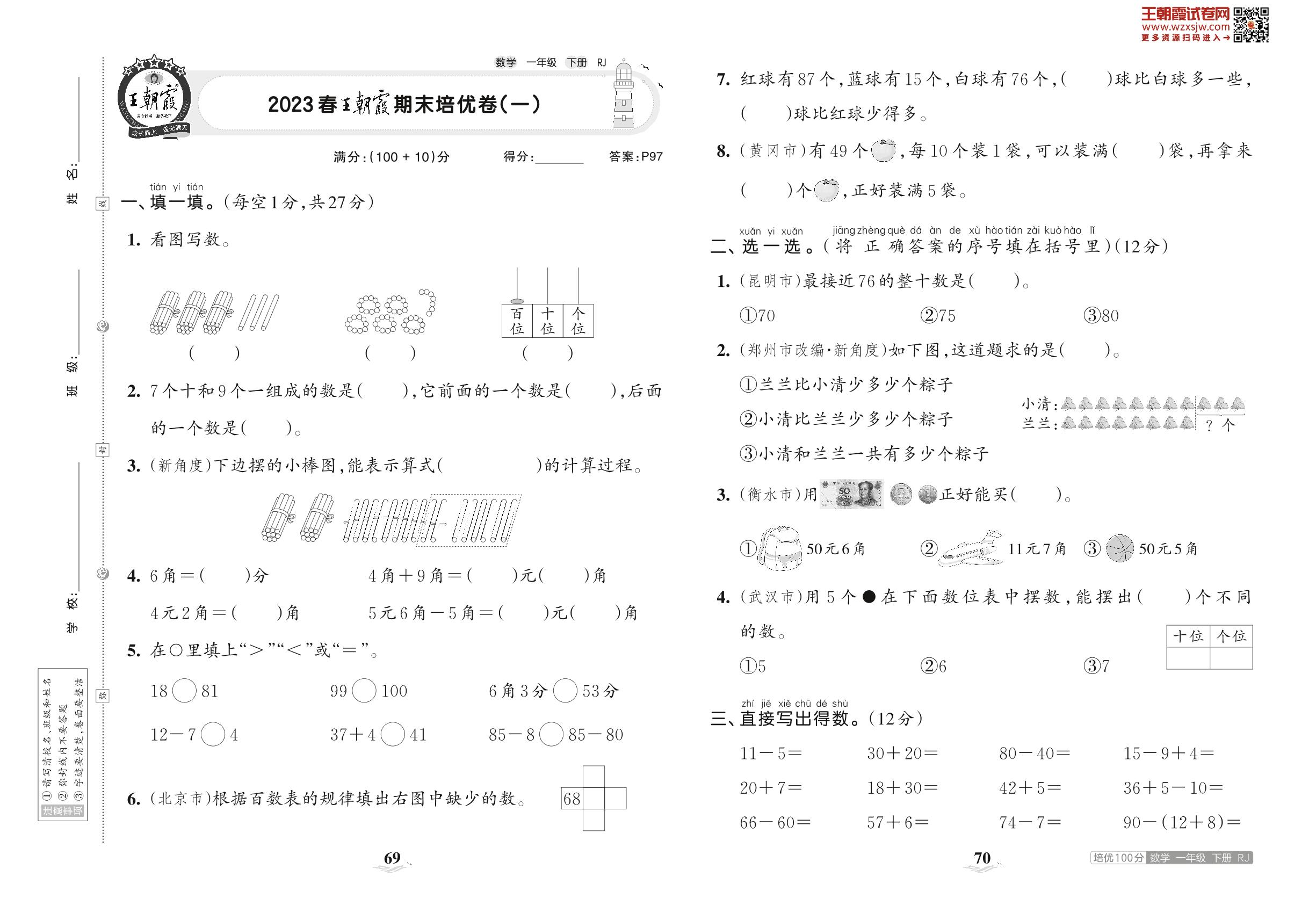 2023下册一年级数学人教版 2023春王朝霞期末培优卷(一)