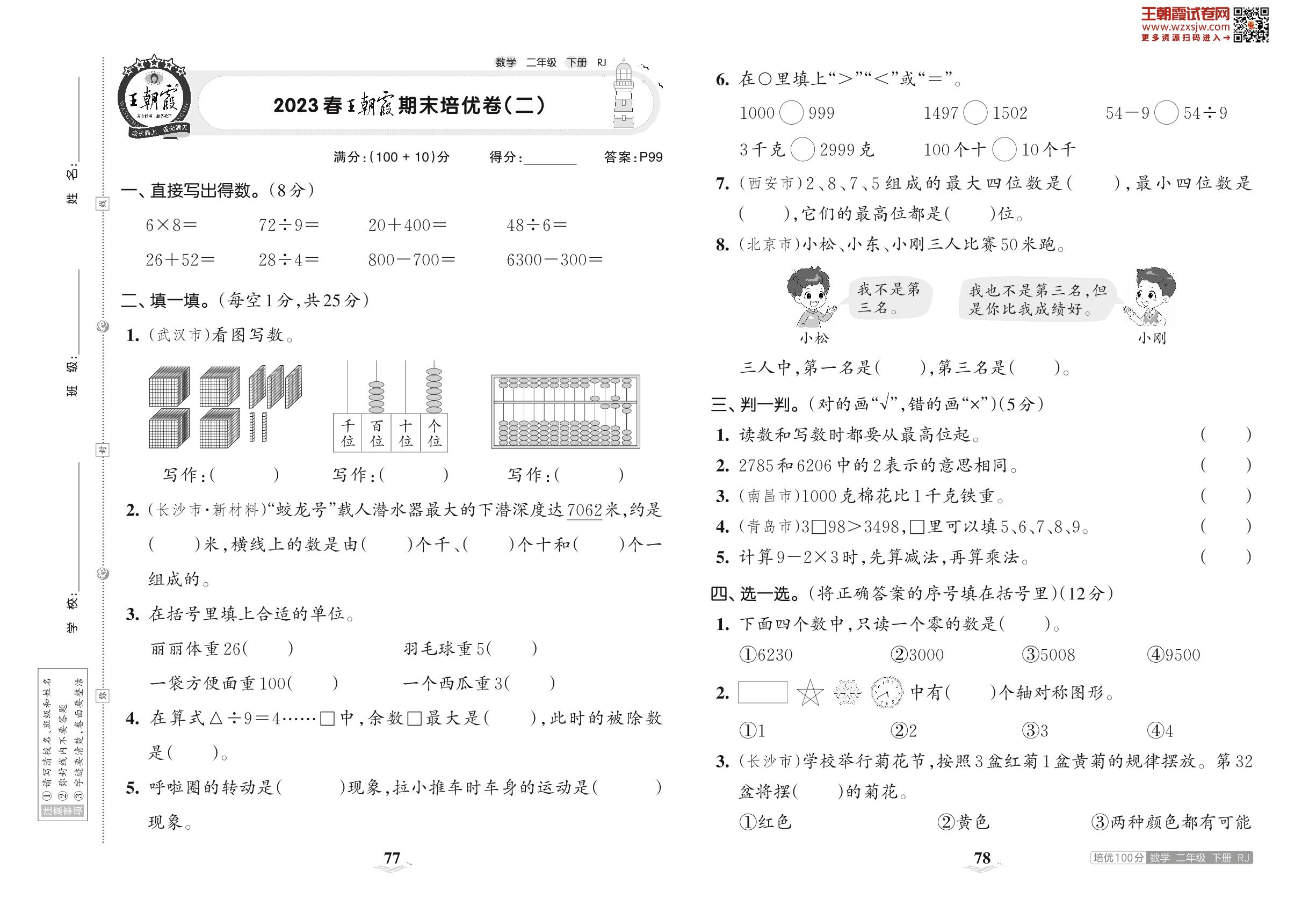 2023下册二年级数学人教版 2023春王朝霞期末培优卷(二)