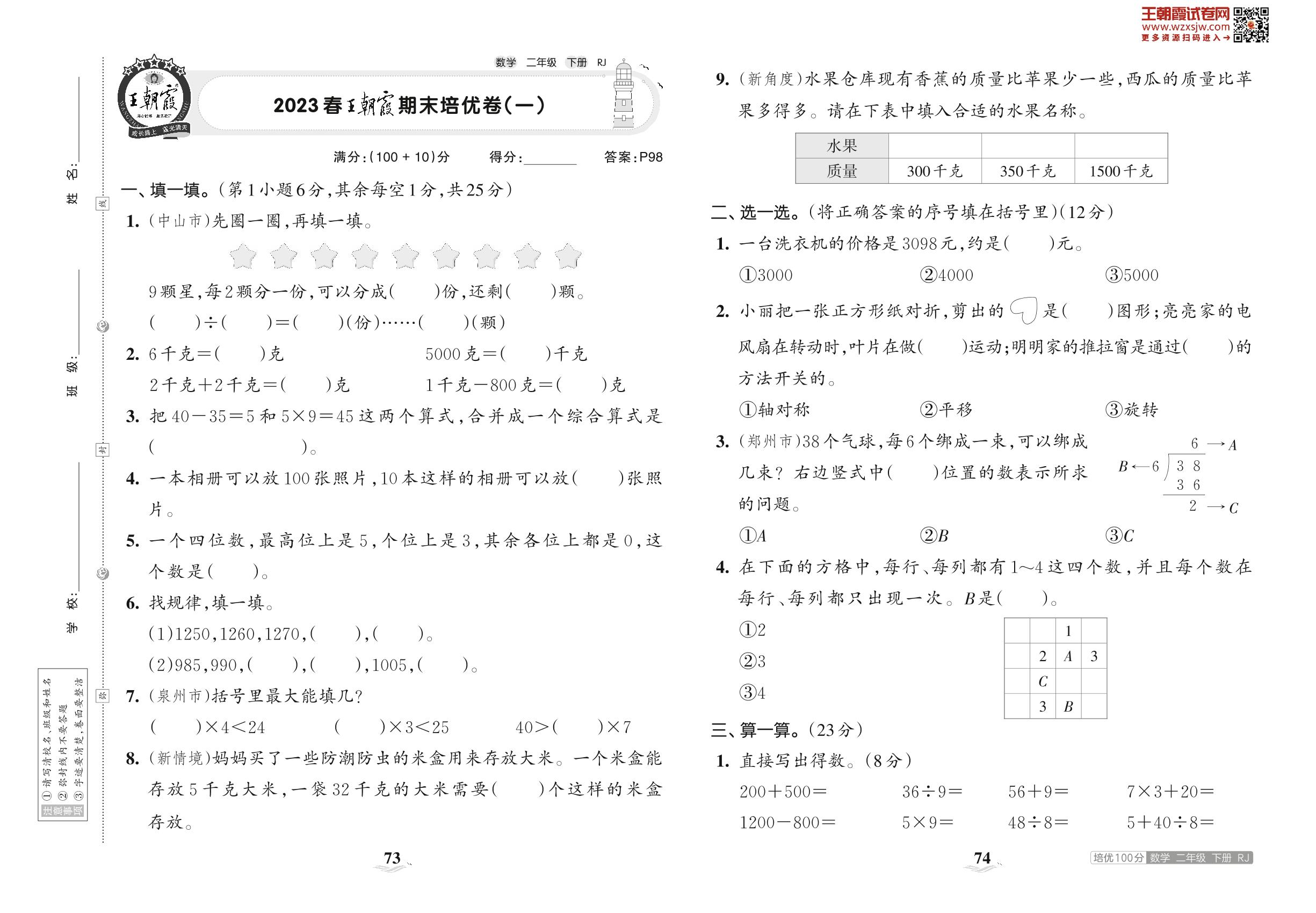 2023下册二年级数学人教版 2023春王朝霞期末培优卷(一)
