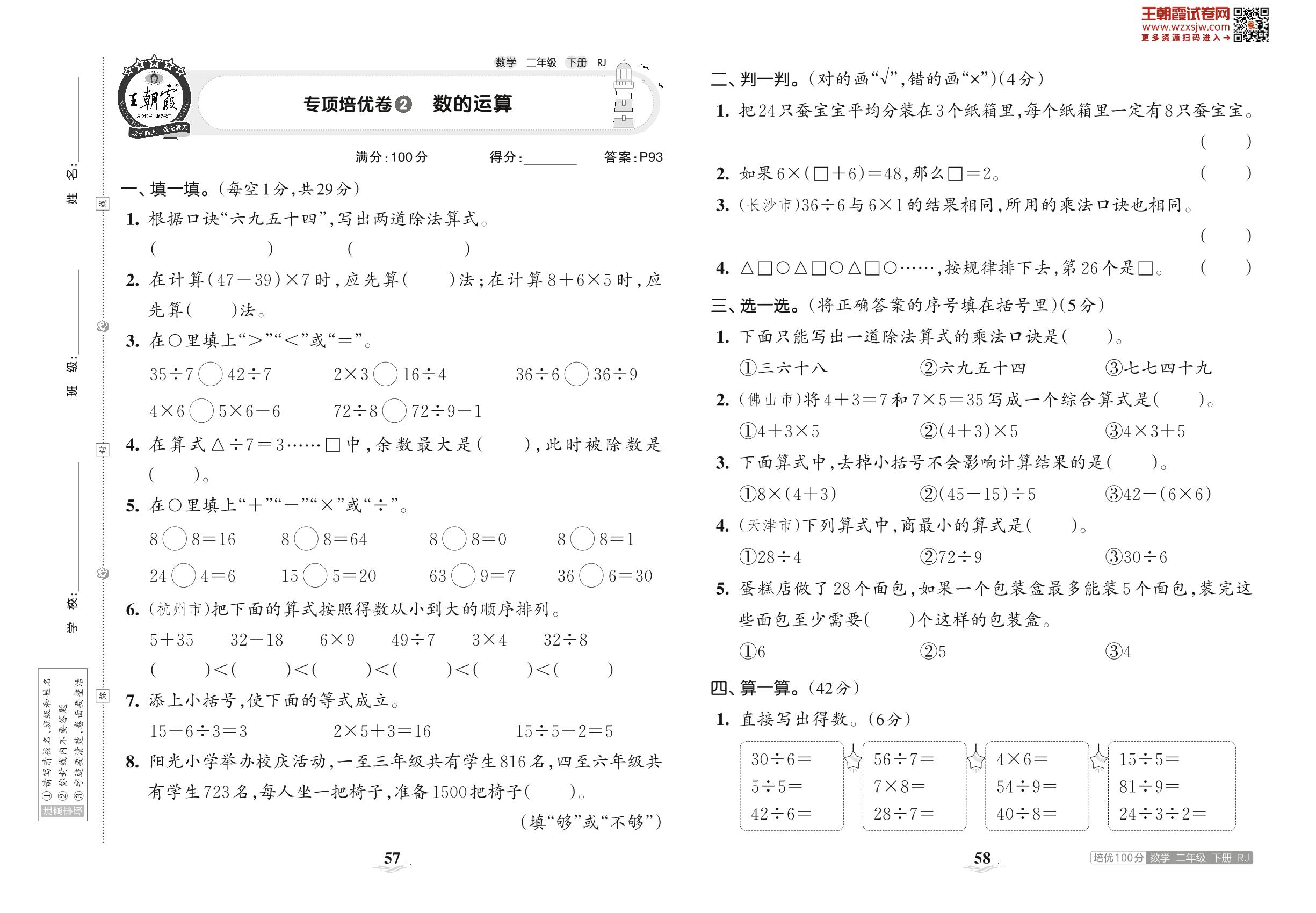 2023下册二年级数学人教版 专项培优卷2 数的运算