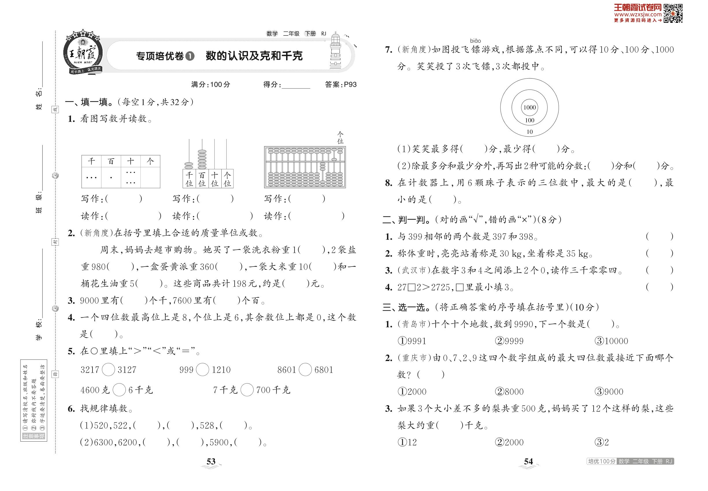2023下册二年级数学人教版 专项培优卷1 数的认识及克和千克