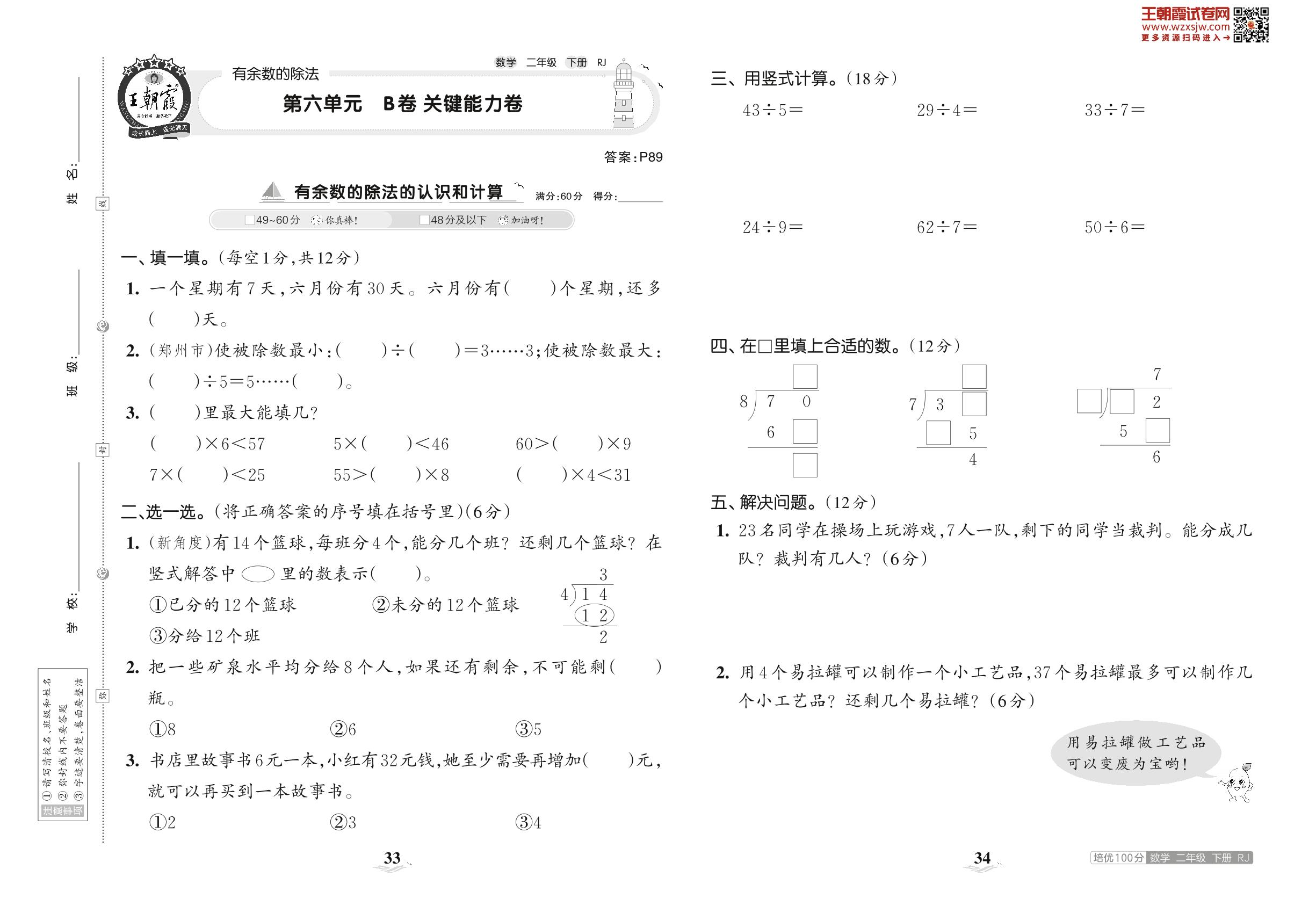 2023下册二年级数学人教版 第六单元 B卷 关键能力卷