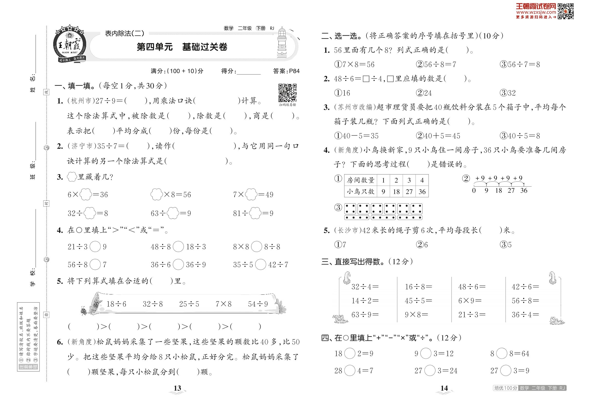2023下册二年级数学人教版 第四单元 基础过关卷