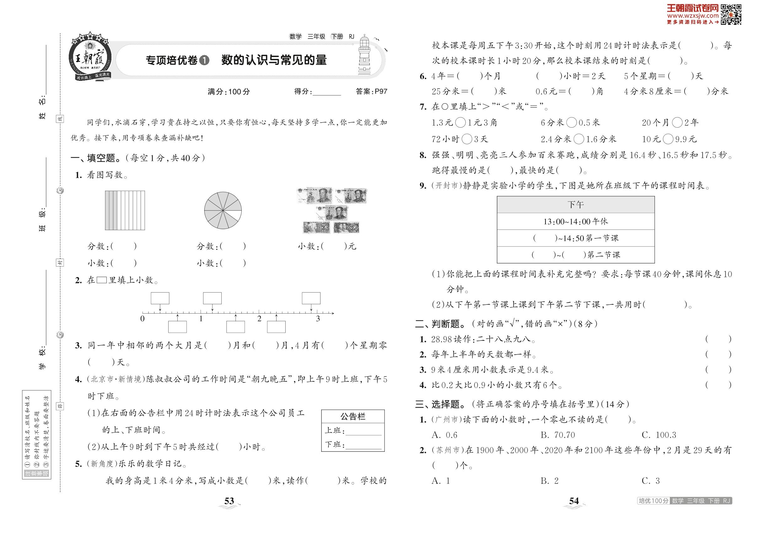 2023下册三年级数学人教版 专项培优卷1 数的认识与常见的量