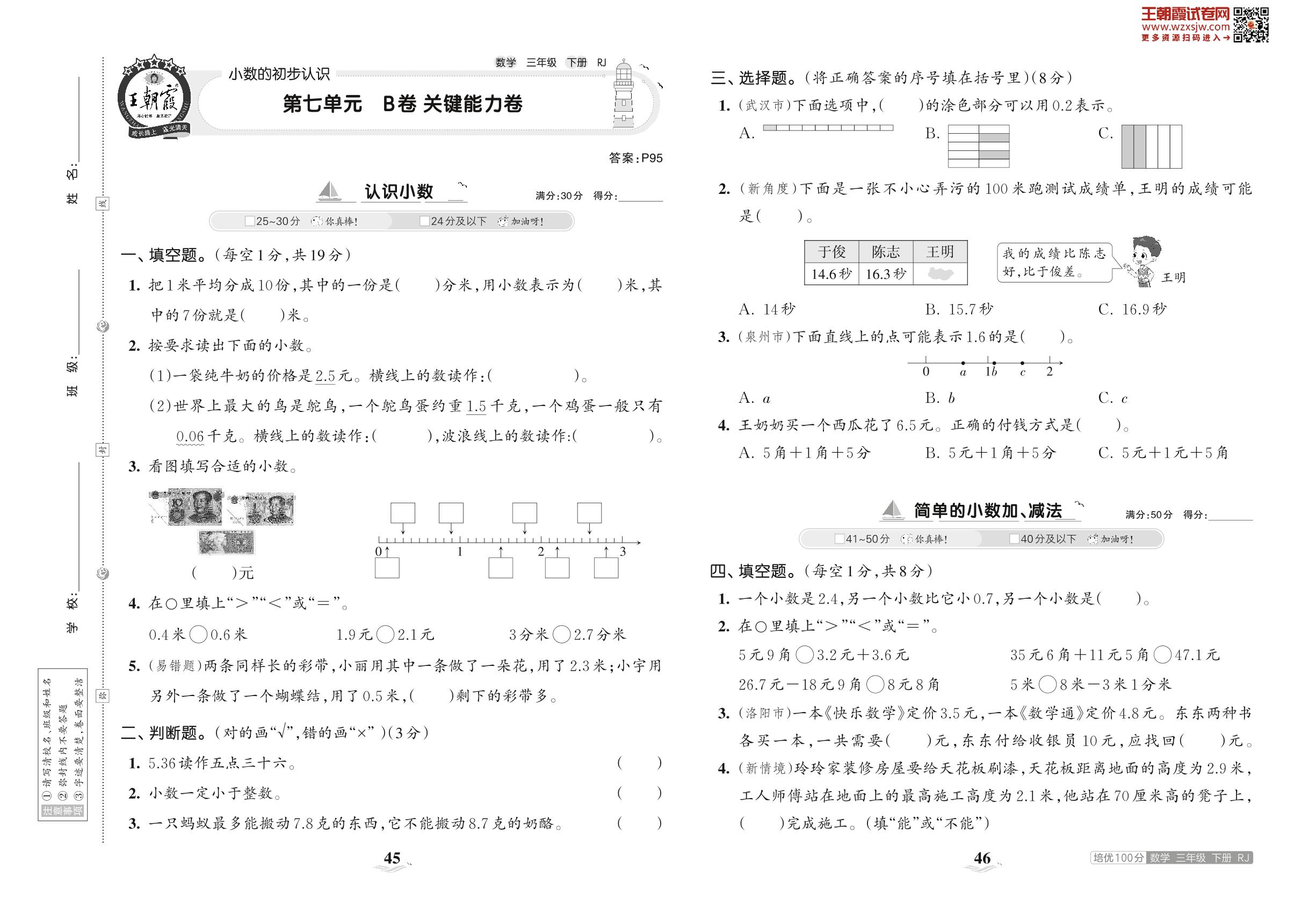 2023下册三年级数学人教版 第七单元 B卷 关键能力卷