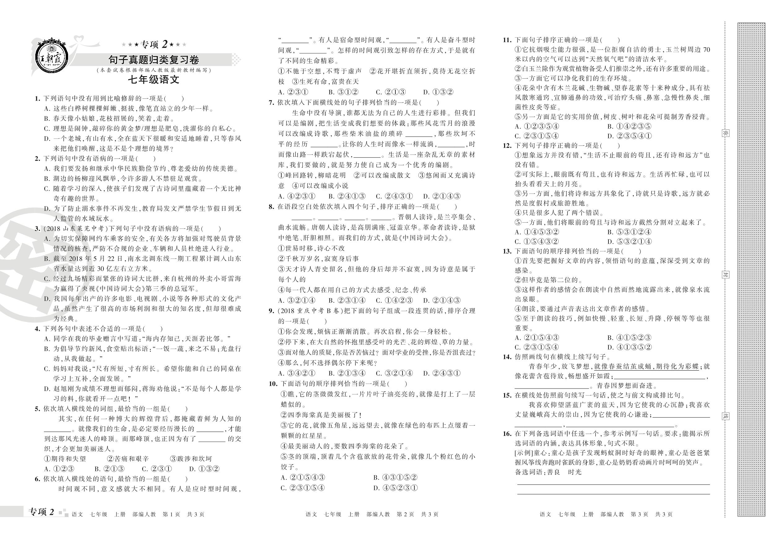 王朝霞期末专项卷——句子真题归类复习卷七年级上册语文(人教版)_R210802162532【0】