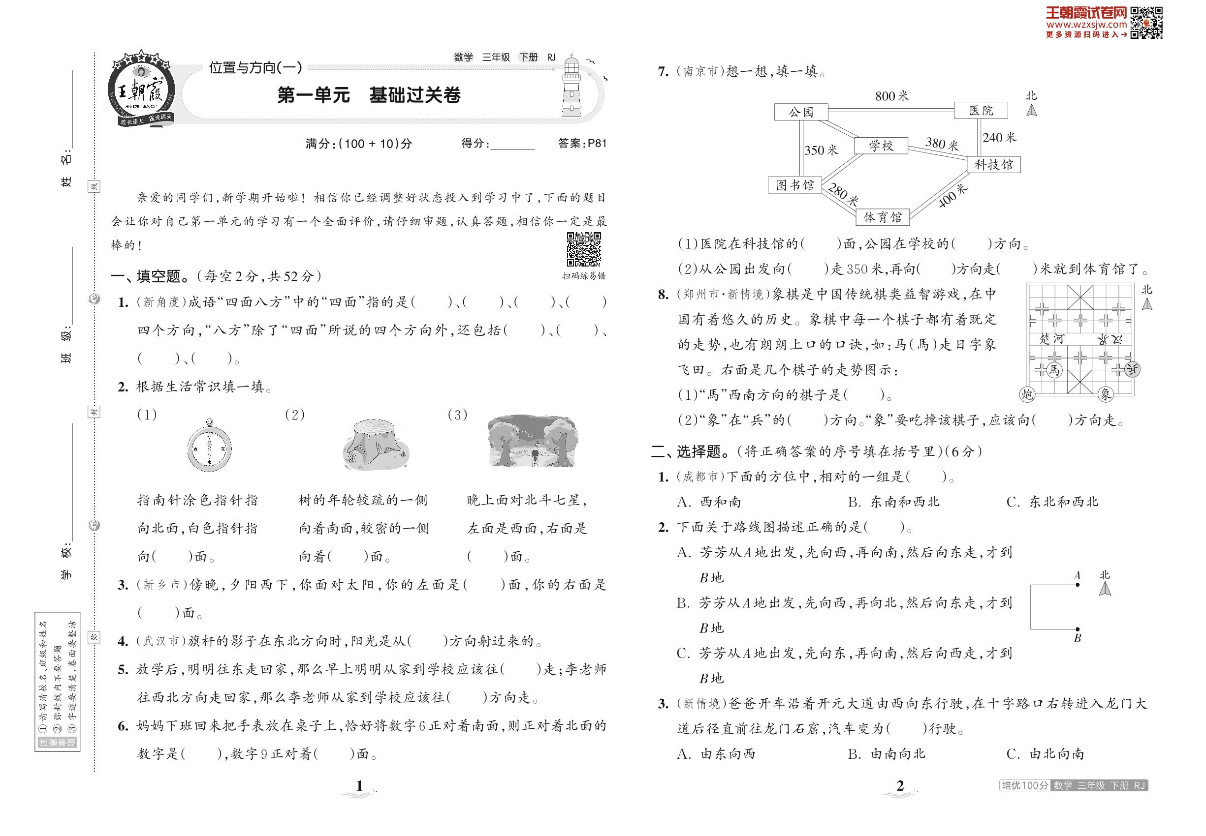 2023下册三年级数学人教版 第一单元 基础过关卷