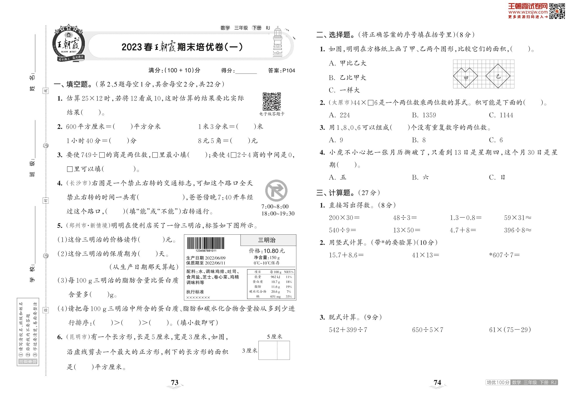 2023下册三年级数学人教版 2023春王朝霞期末培优卷(一)