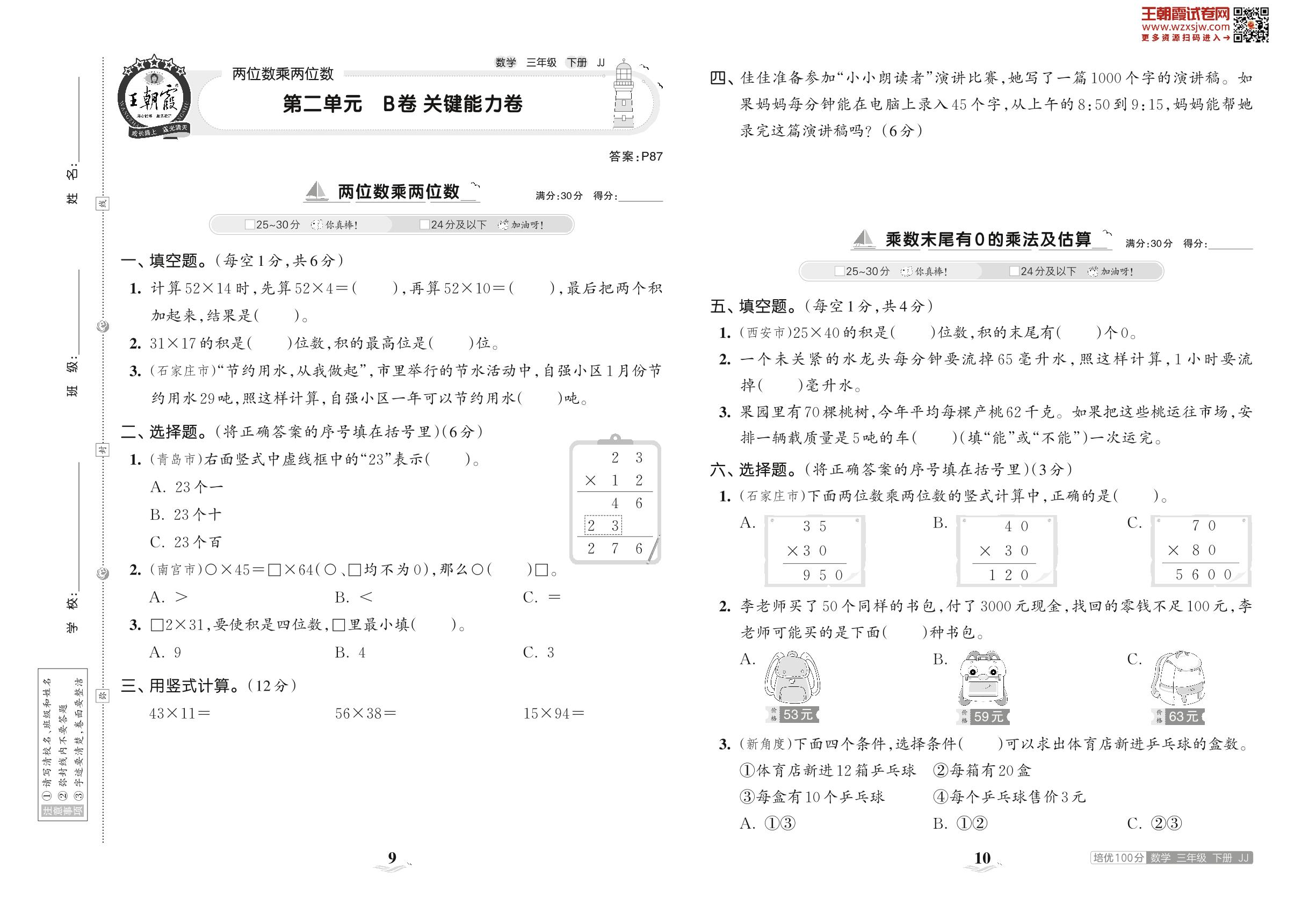 2023下册三年级数学冀教版 第二单元 B卷 关键能力卷