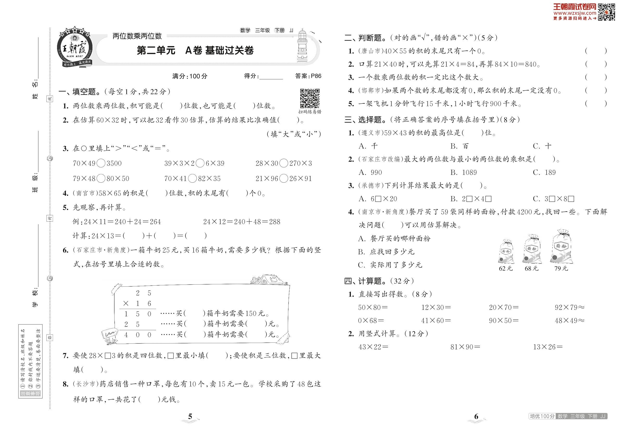 2023下册三年级数学冀教版 第二单元 A卷 基础过关卷