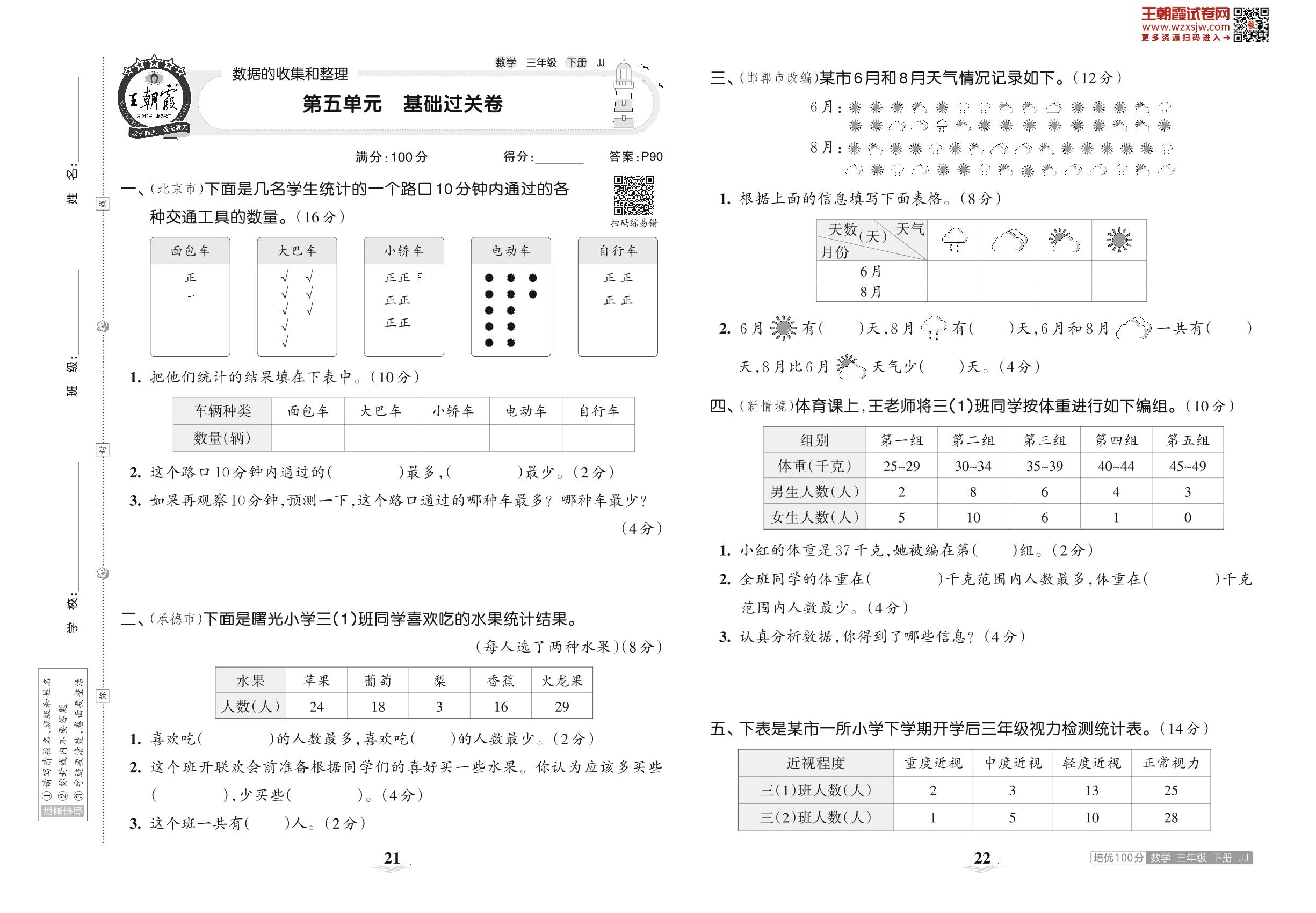 2023下册三年级数学冀教版 第五单元 基础过关卷