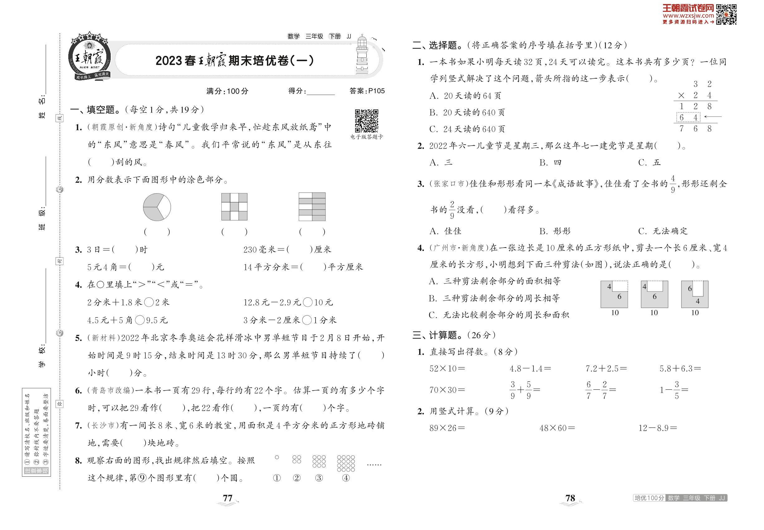 2023下册三年级数学冀教版 2023春王朝霞期末培优卷(一)