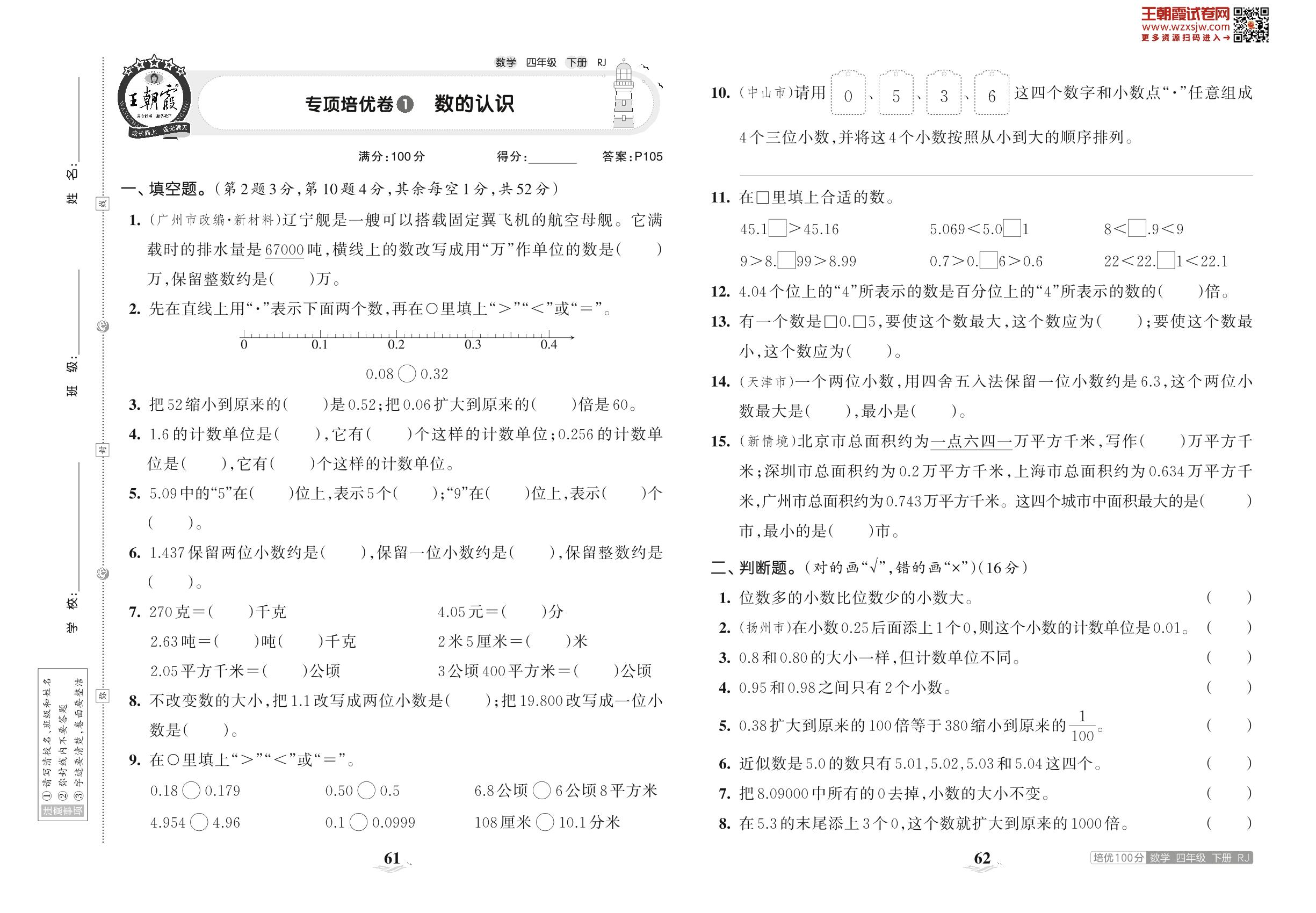 2023下册四年级数学人教版 专项培优卷1 数的认识