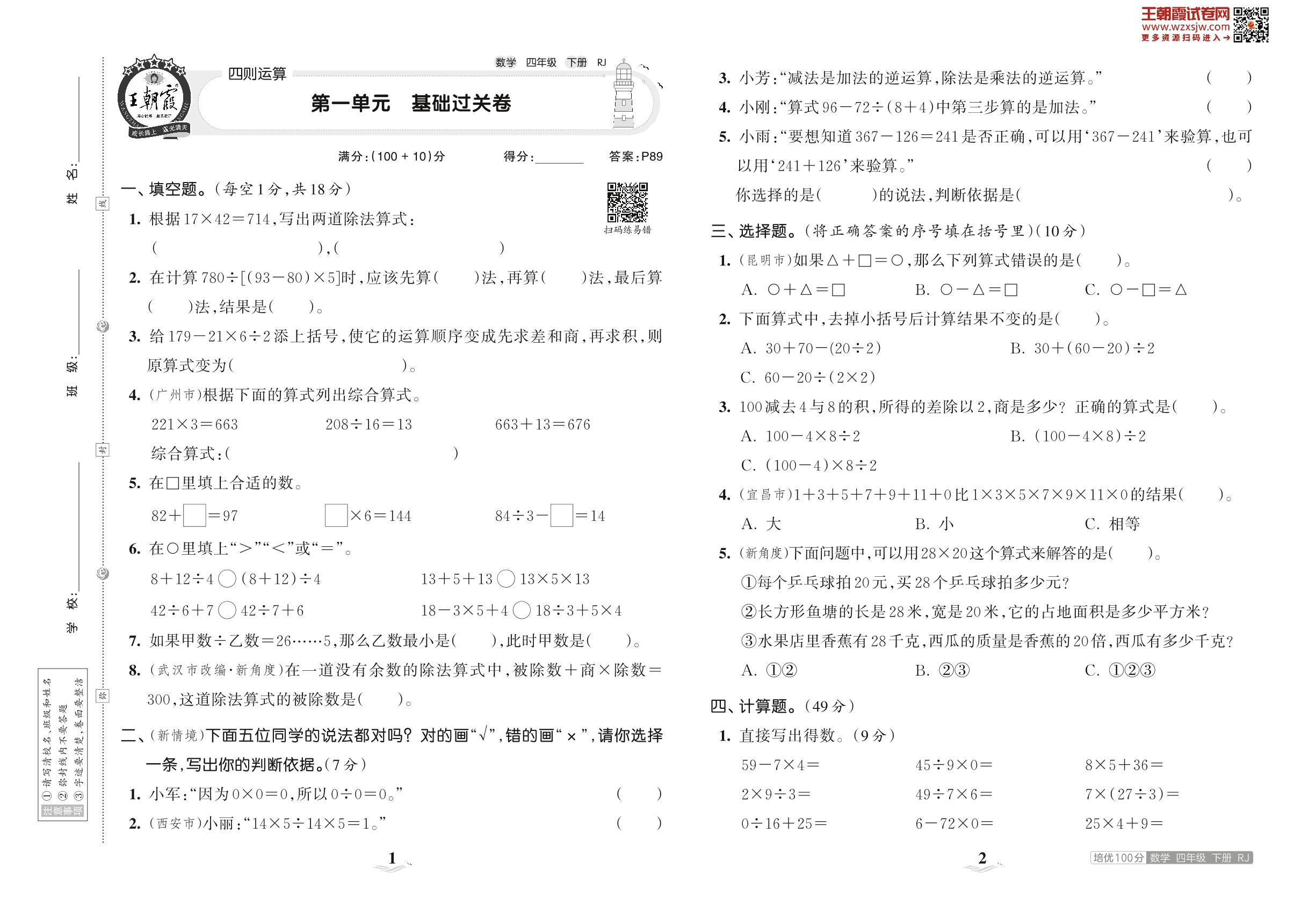 2023下册四年级数学人教版 第一单元 基础过关卷