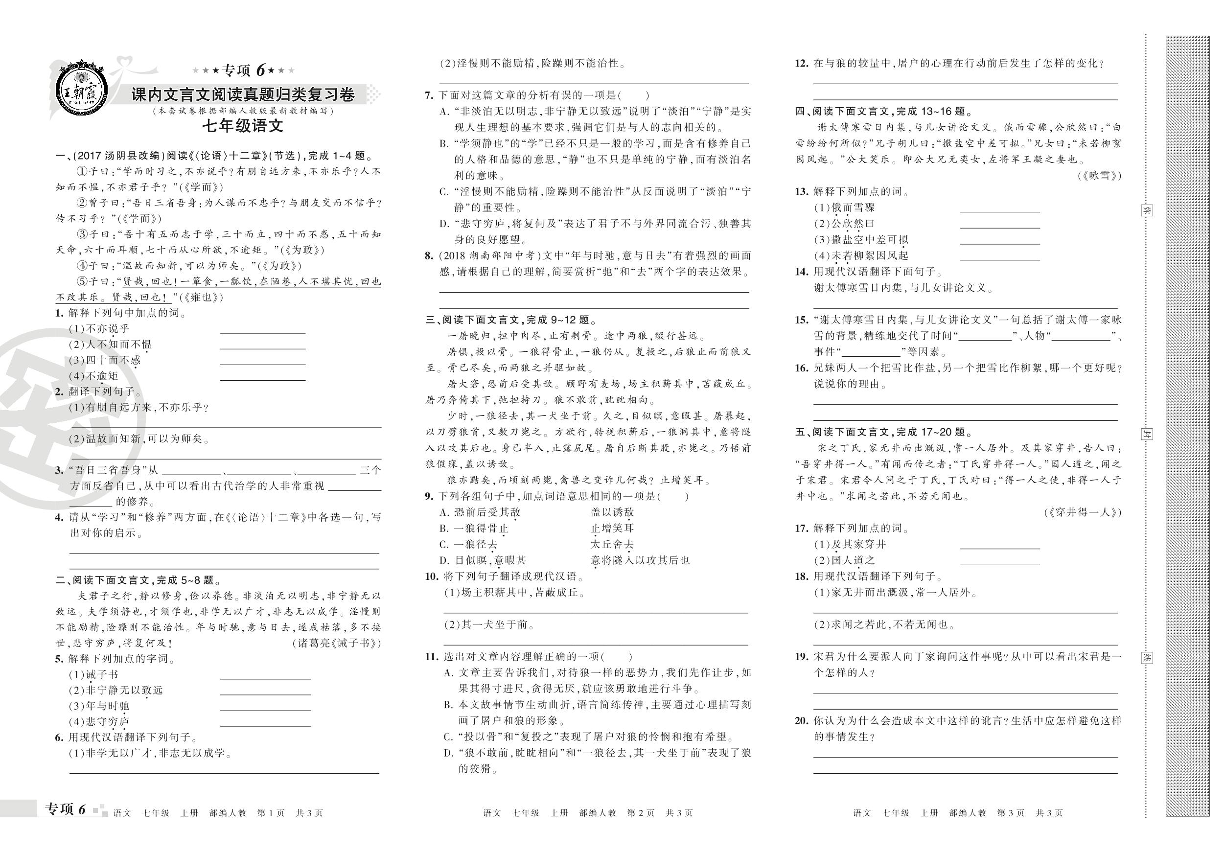 王朝霞期末专项卷——课内文言文阅读真题归类复习卷七年级上册语文(人教版)_R210802162546【0】