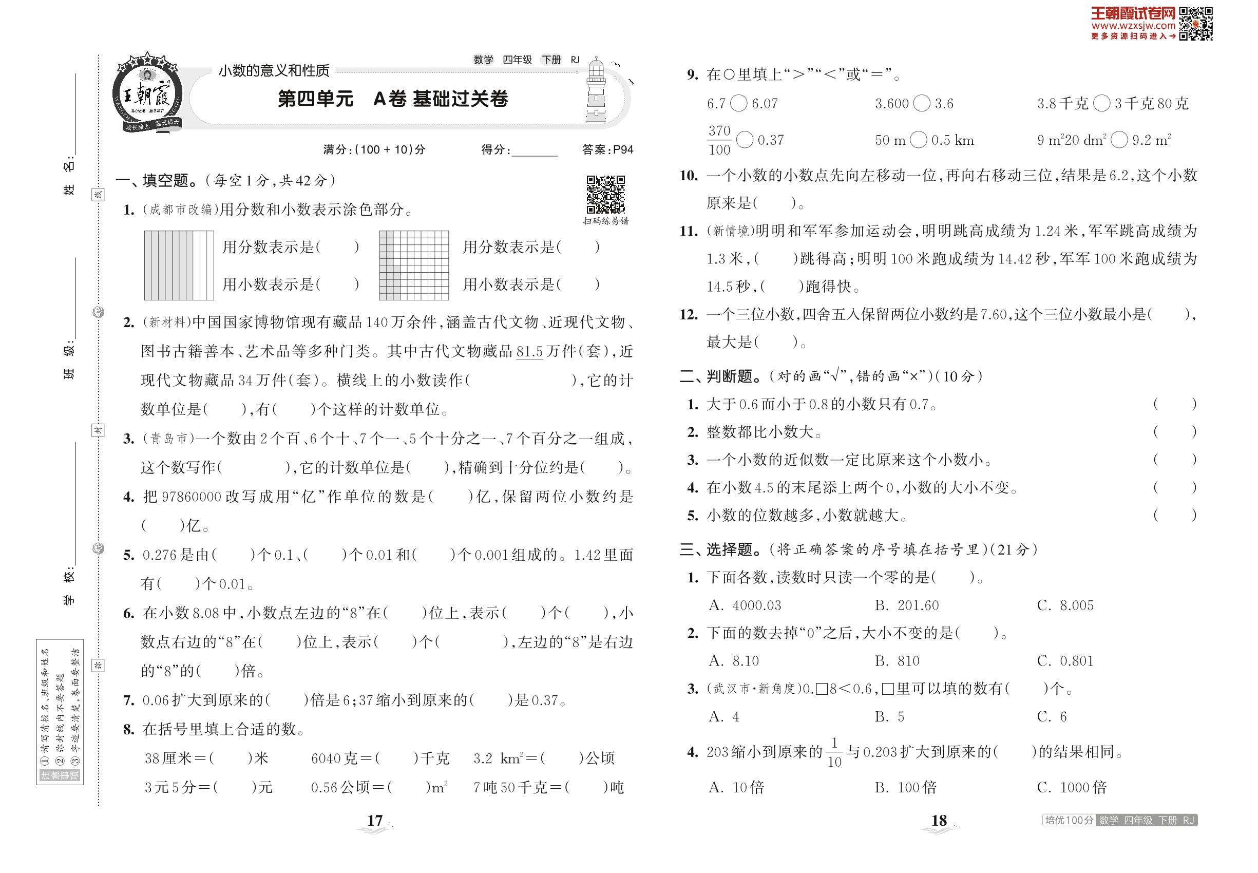 2023下册四年级数学人教版 第四单元 A卷 基础过关卷