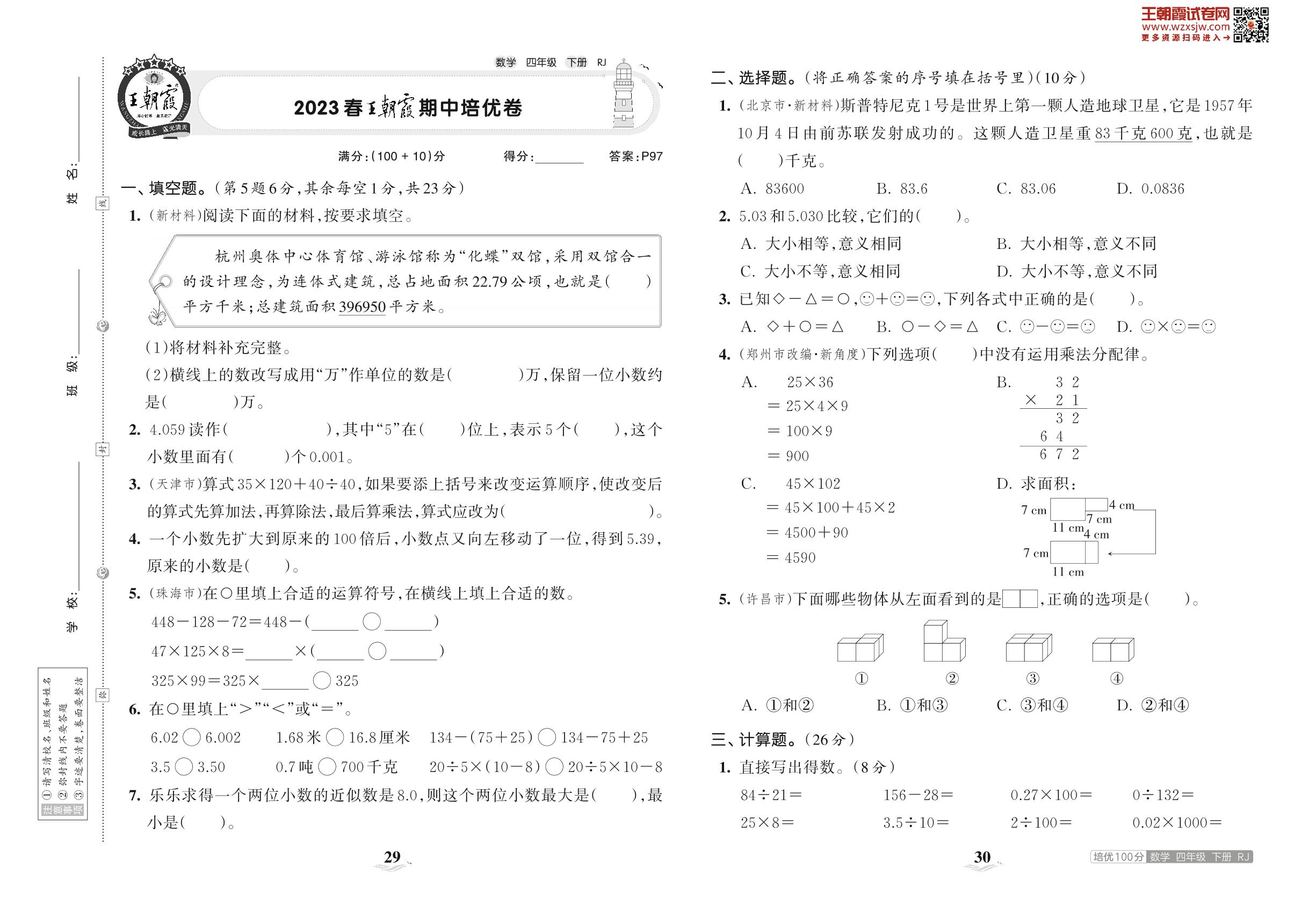 2023下册四年级数学人教版 2023春王朝霞期中培优卷