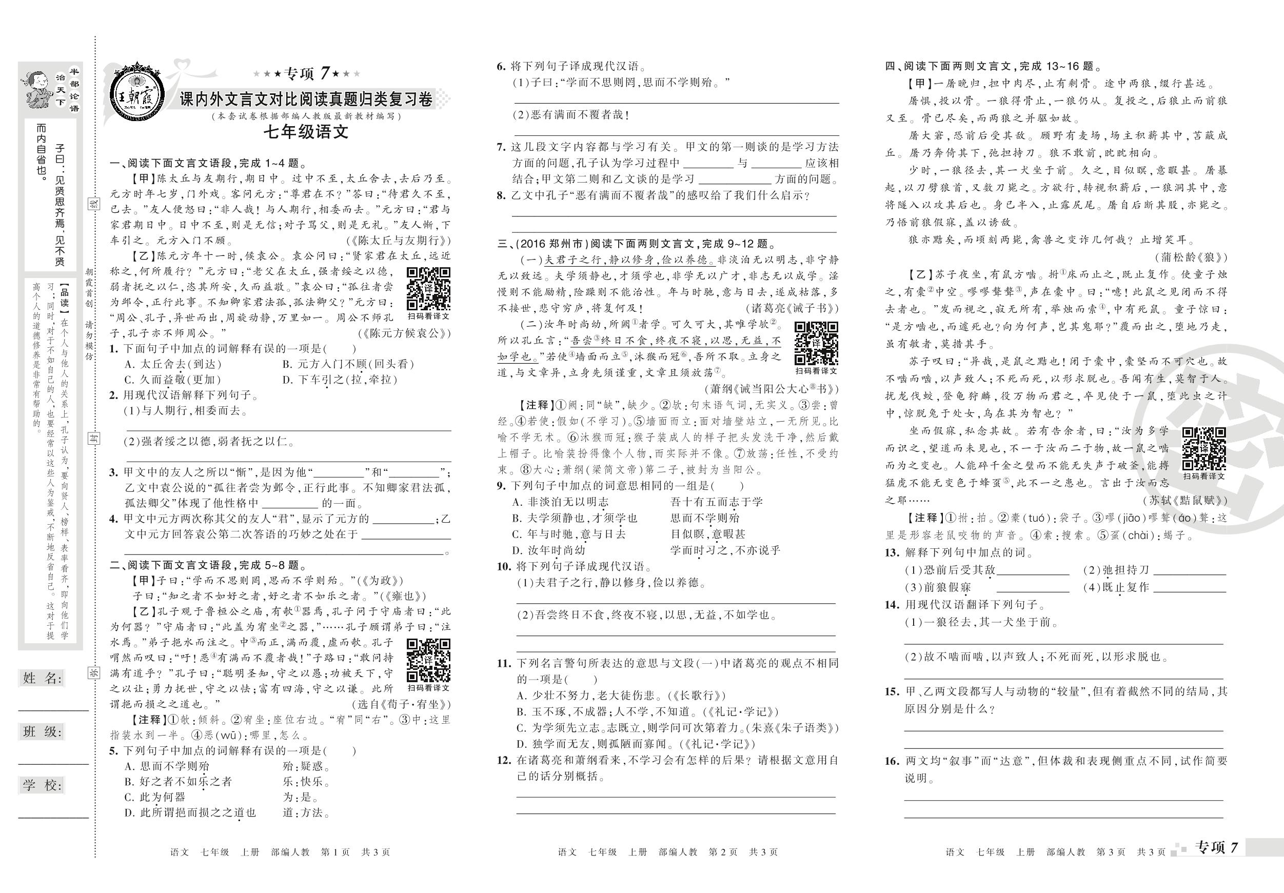 王朝霞期末专项卷——课内外文言文对比阅读真题归类复习卷七年级上册语文(人教版)_R210802162550【0】