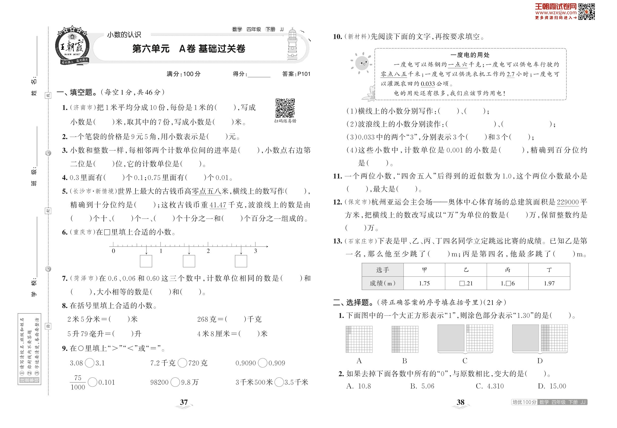 2023下册四年级数学冀教版 第六单元 A卷 基础过关卷