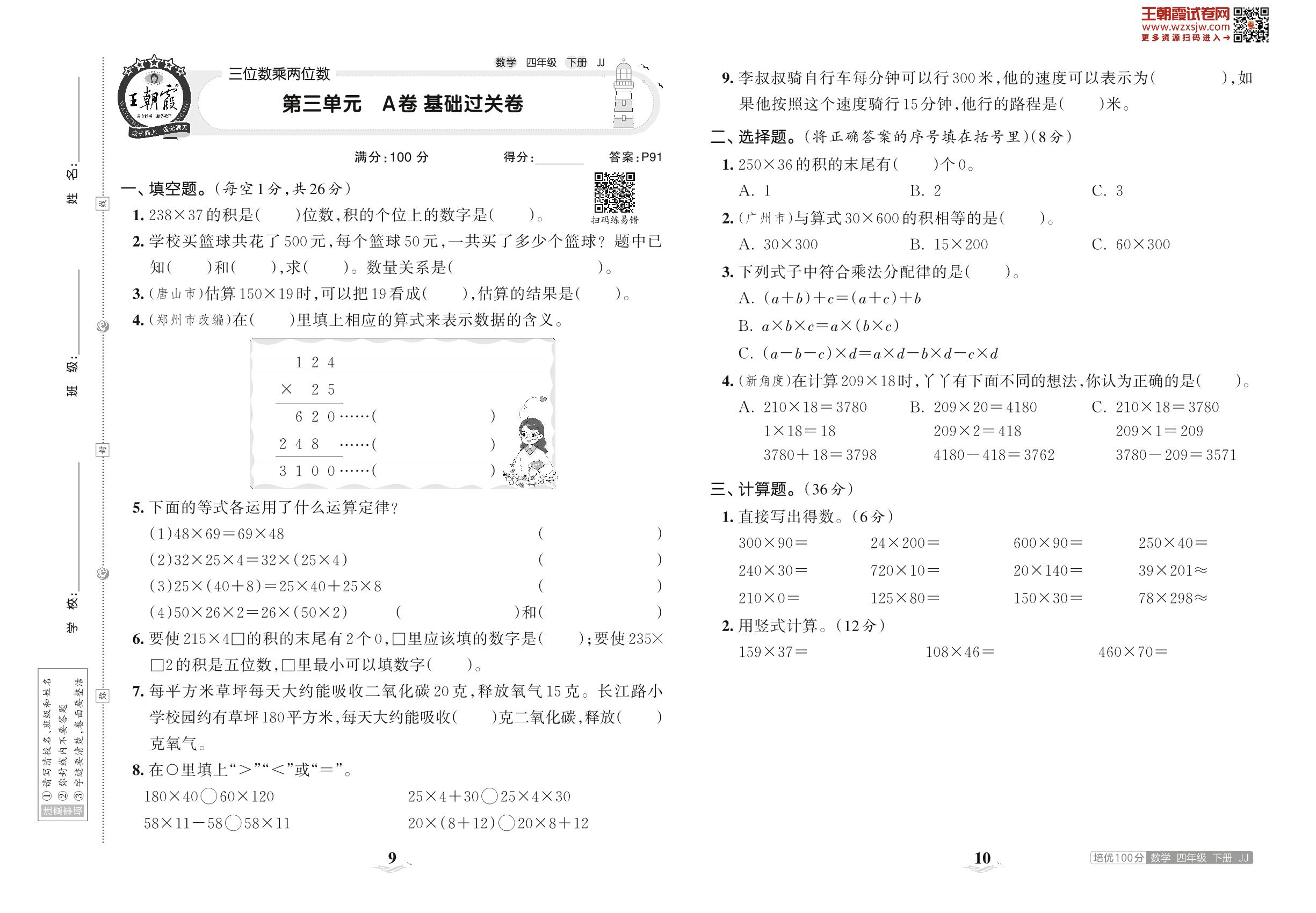 2023下册四年级数学冀教版 第三单元 A卷 基础过关卷