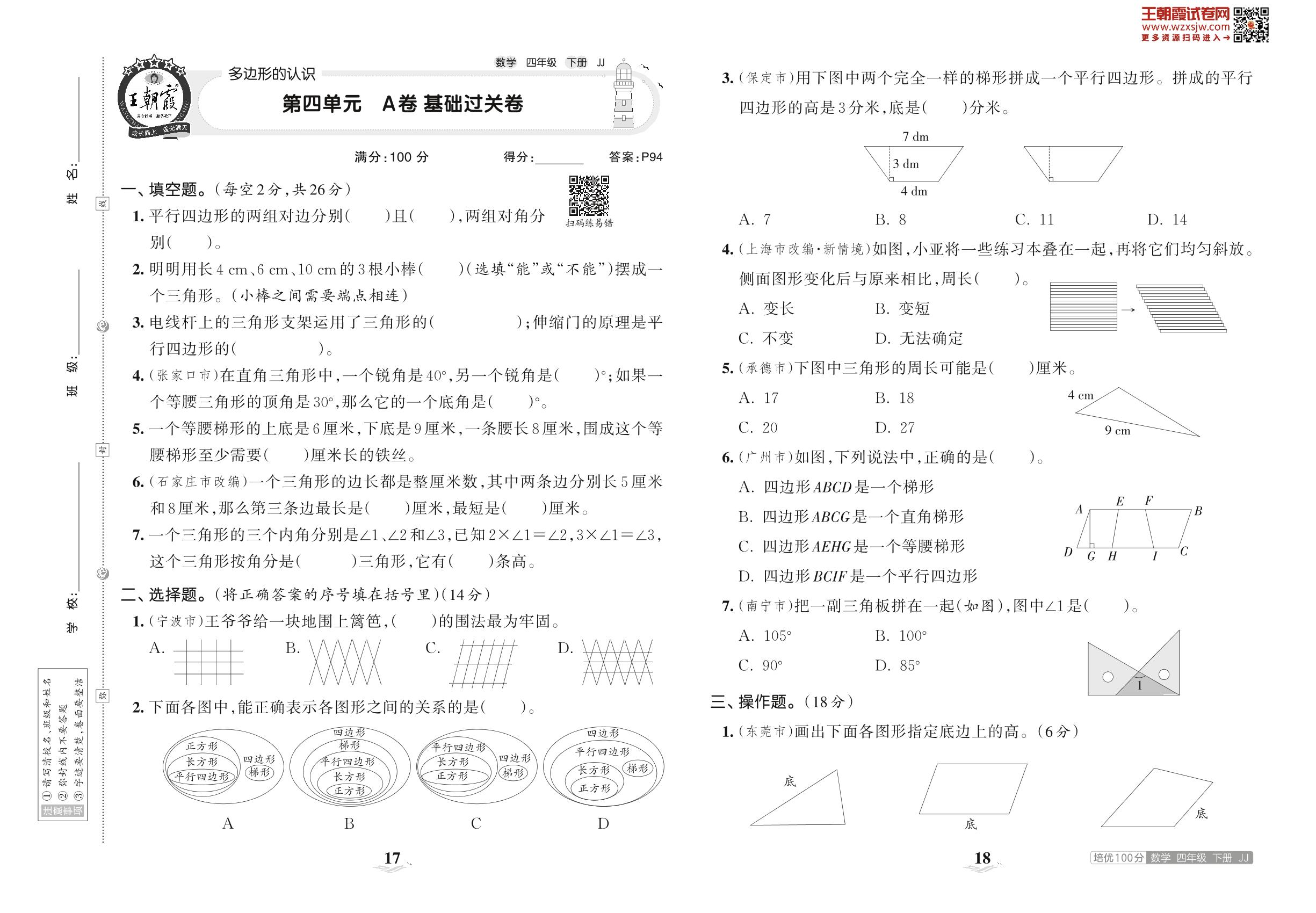 2023下册四年级数学冀教版 第四单元 A卷 基础过关卷
