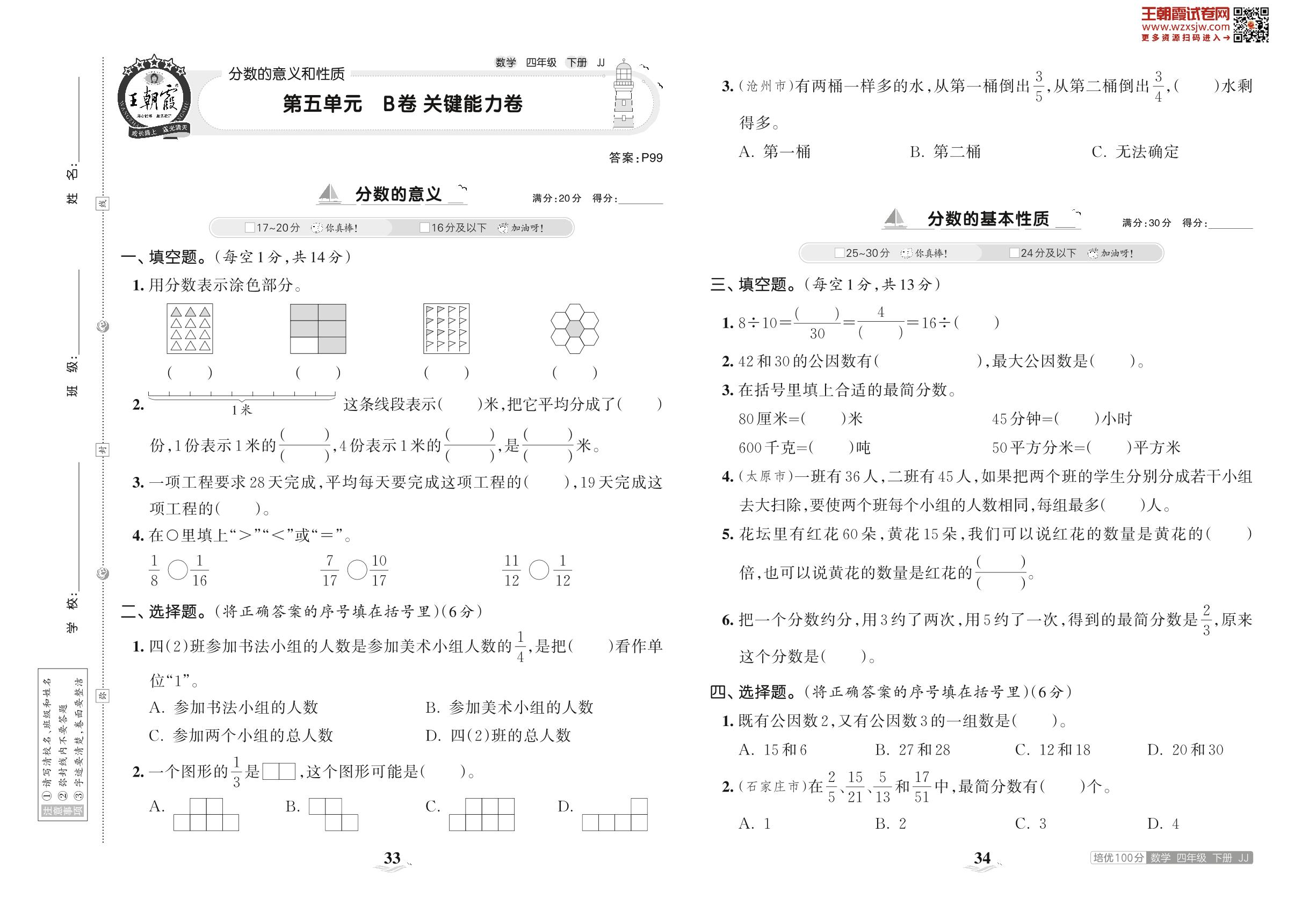 2023下册四年级数学冀教版 第五单元 B卷 关键能力卷