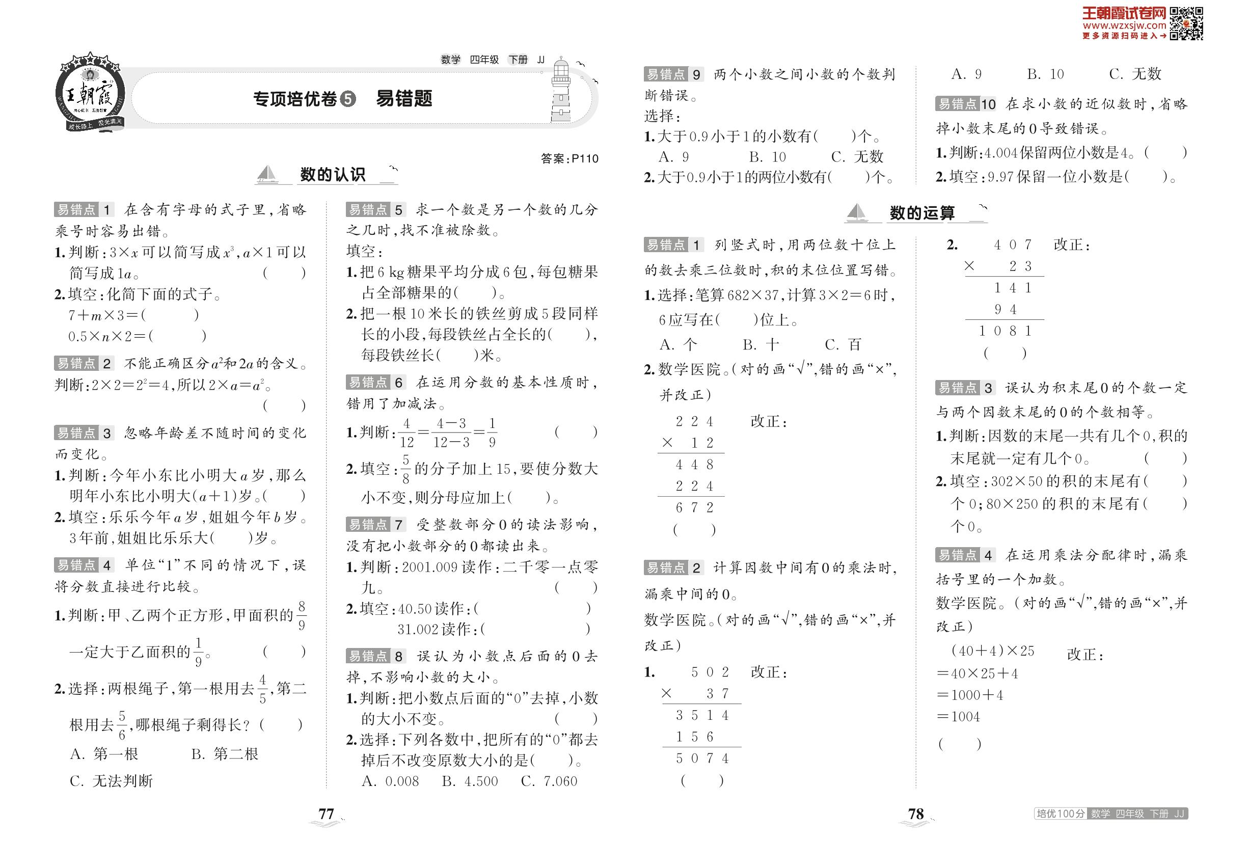 2023下册四年级数学冀教版 专项培优卷5 易错题