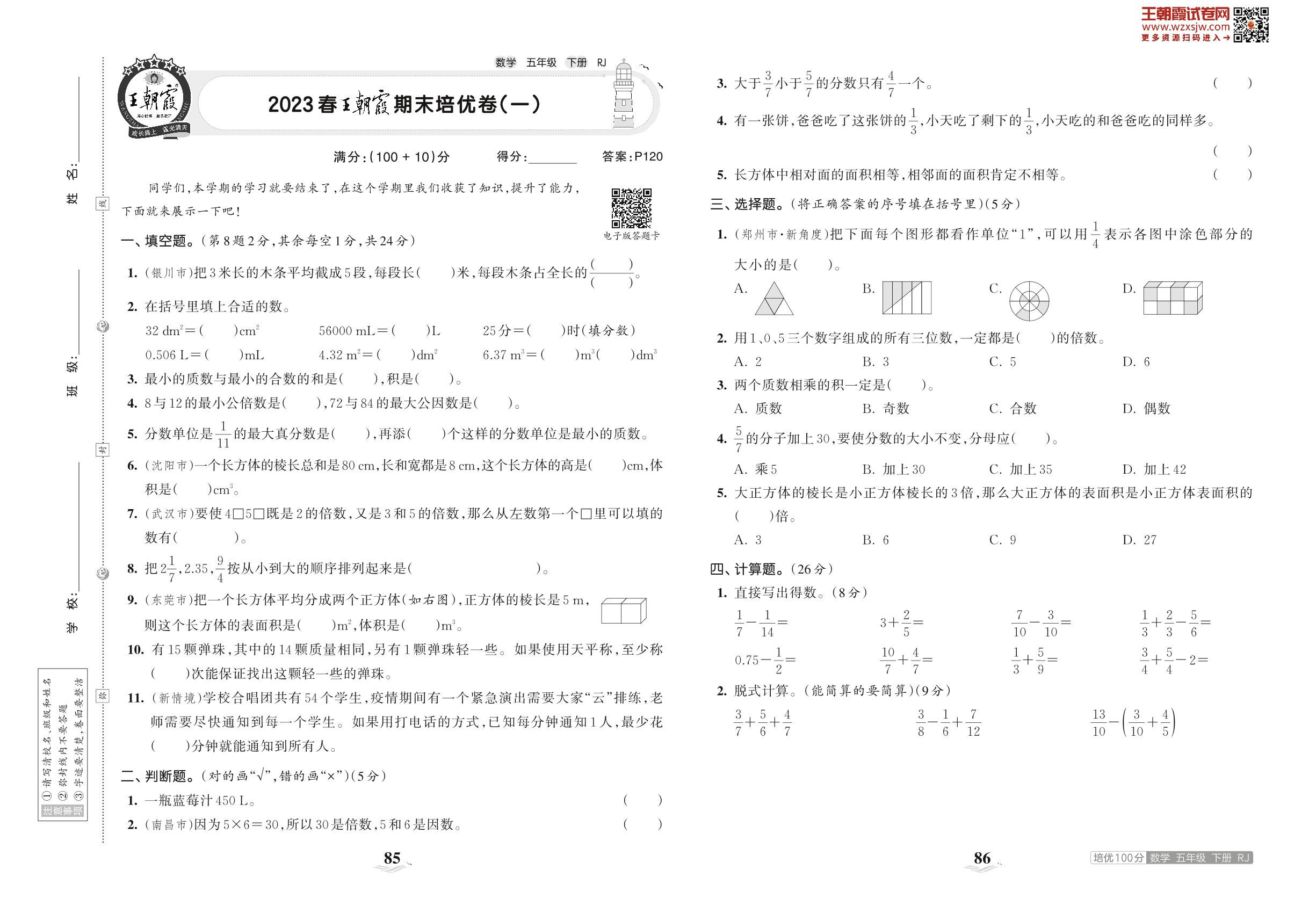 2023下册五年级数学人教版 2023春王朝霞期末培优卷(一)