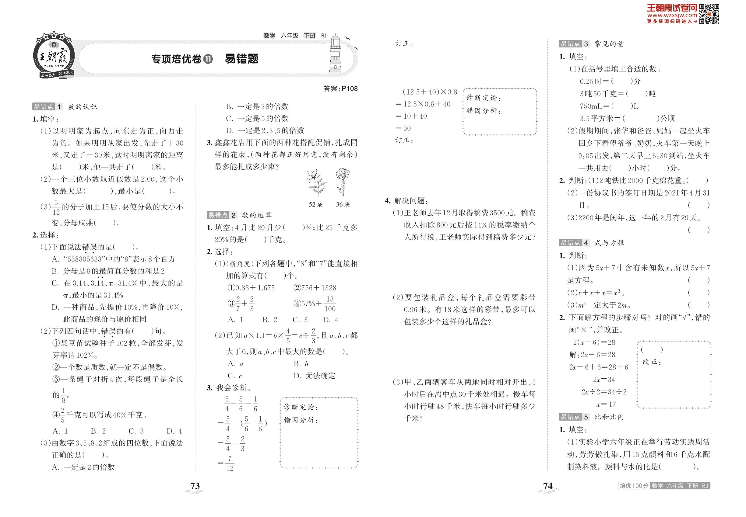 2023下册六年级数学人教版 专项培优卷11 易错题