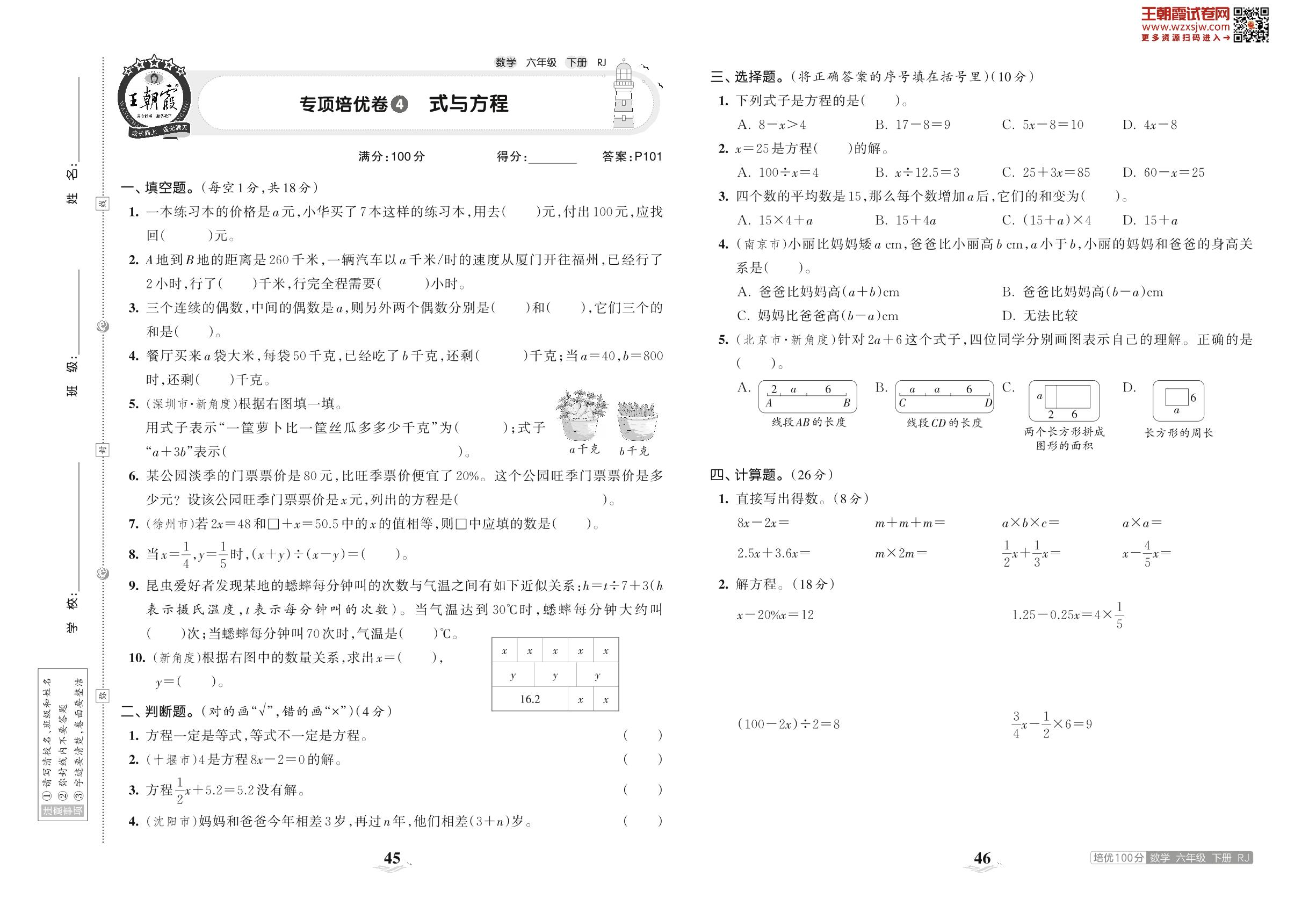 2023下册六年级数学人教版 专项培优卷4 式与方程