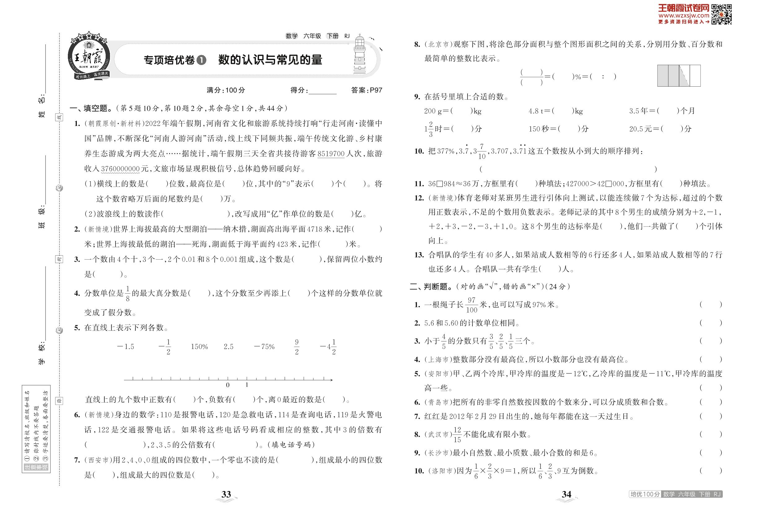 2023下册六年级数学人教版 专项培优卷1 数的认识与常见的量