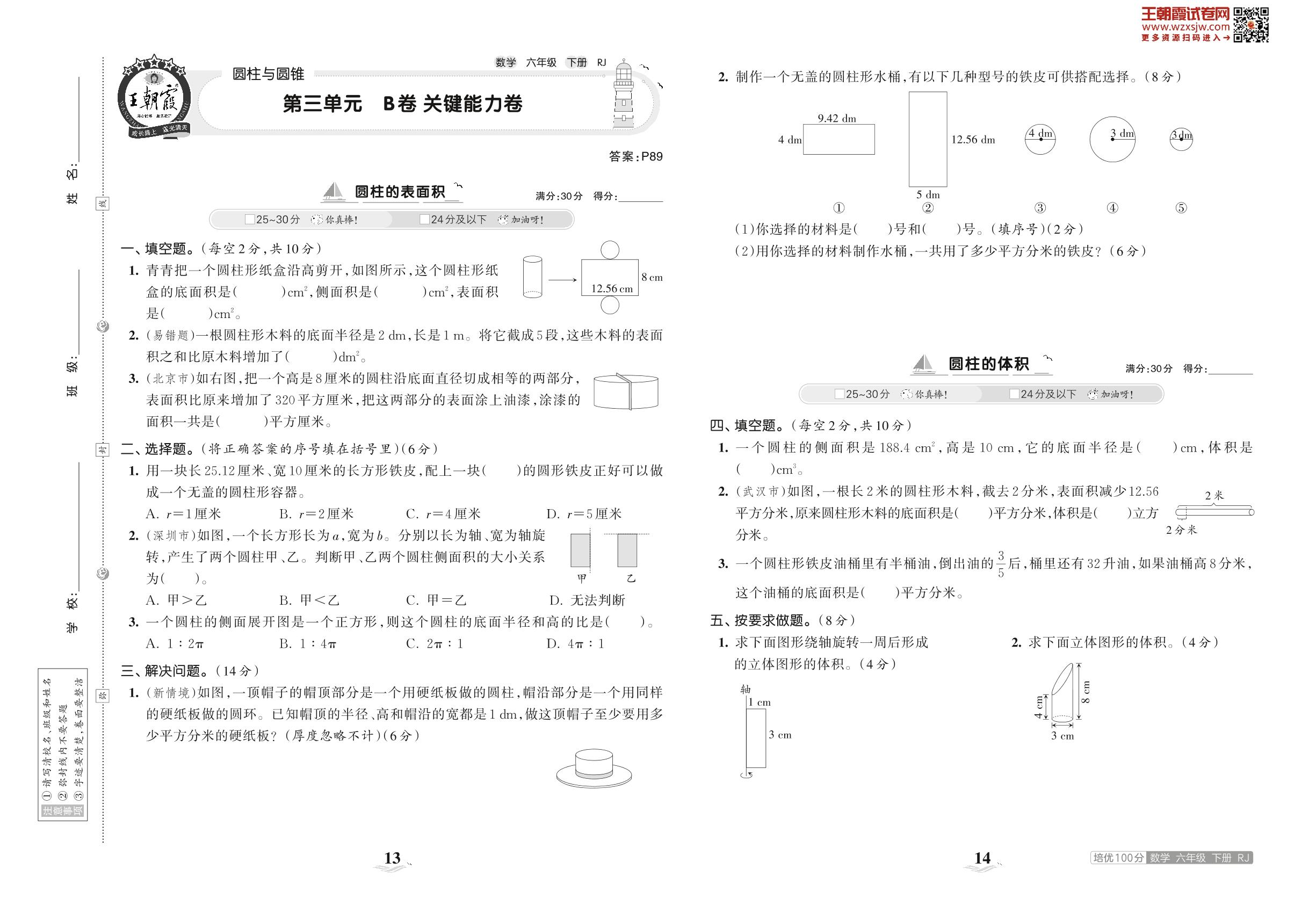 2023下册六年级数学人教版 第三单元 B卷 关键能力卷