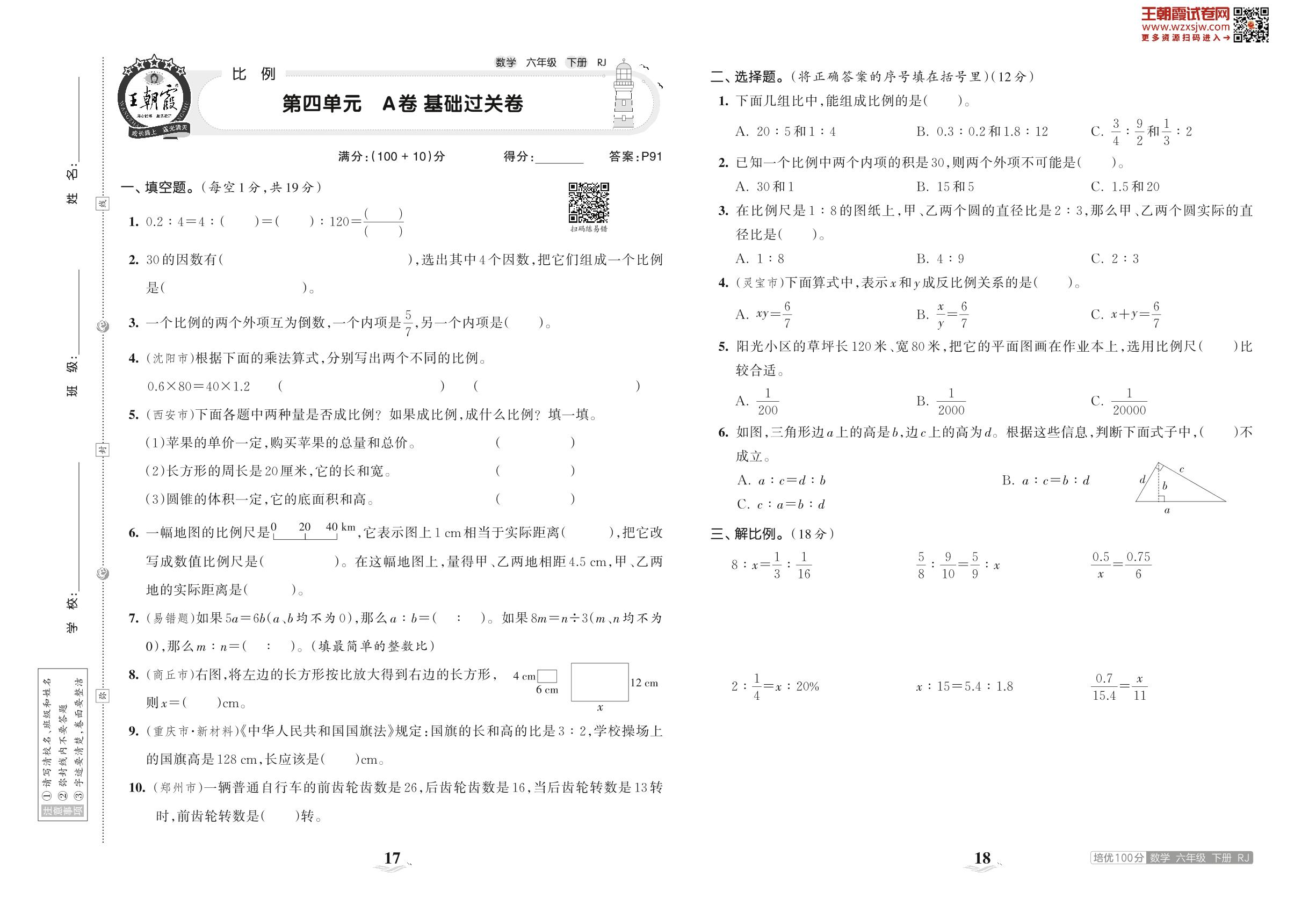 2023下册六年级数学人教版 第四单元 A卷 基础过关卷