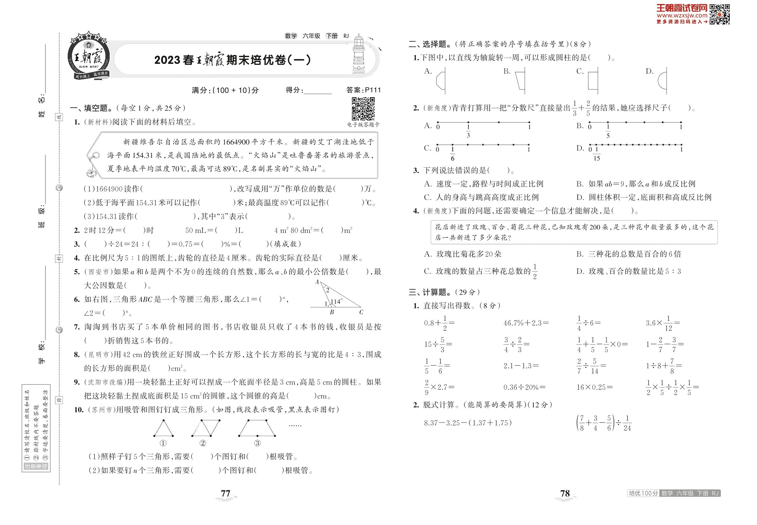 2023下册六年级数学人教版 2023春王朝霞期末培优卷(一)