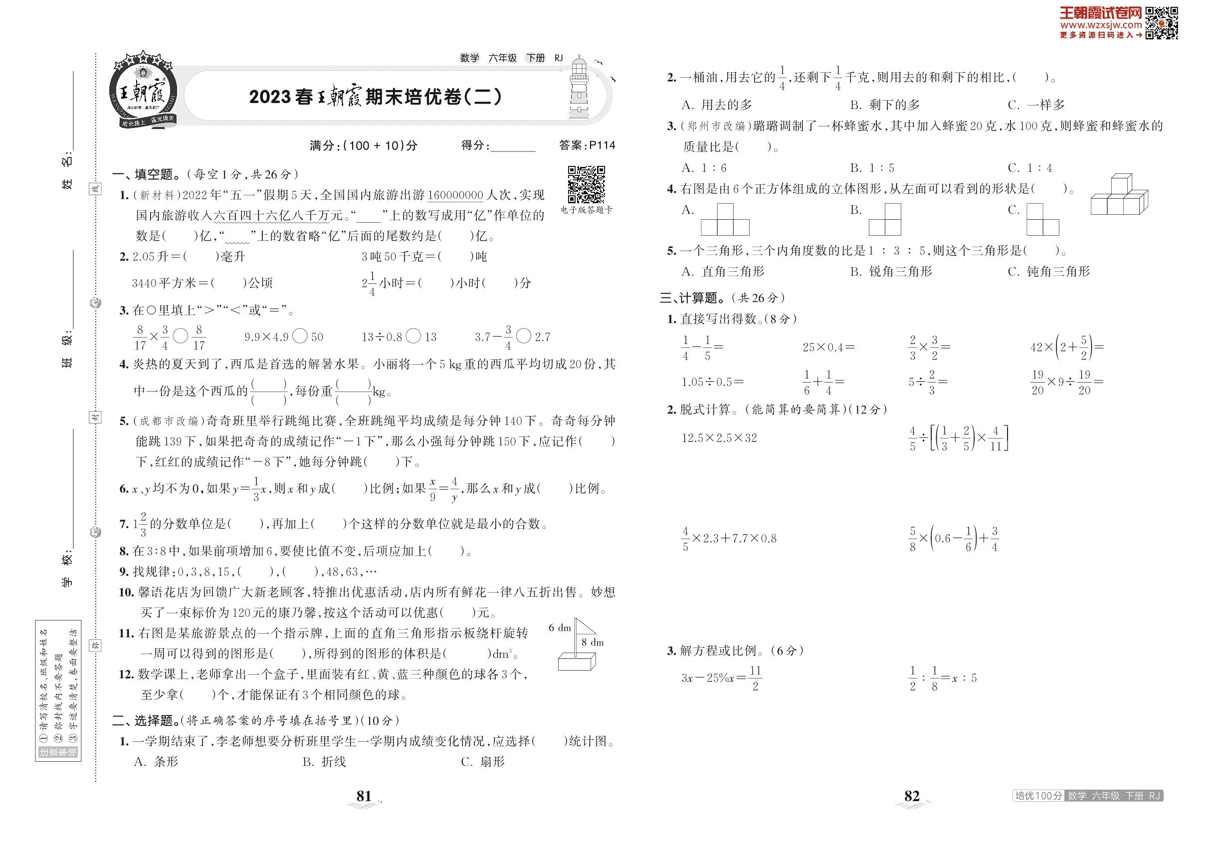 2023下册六年级数学人教版 2023春王朝霞期末培优卷(二)