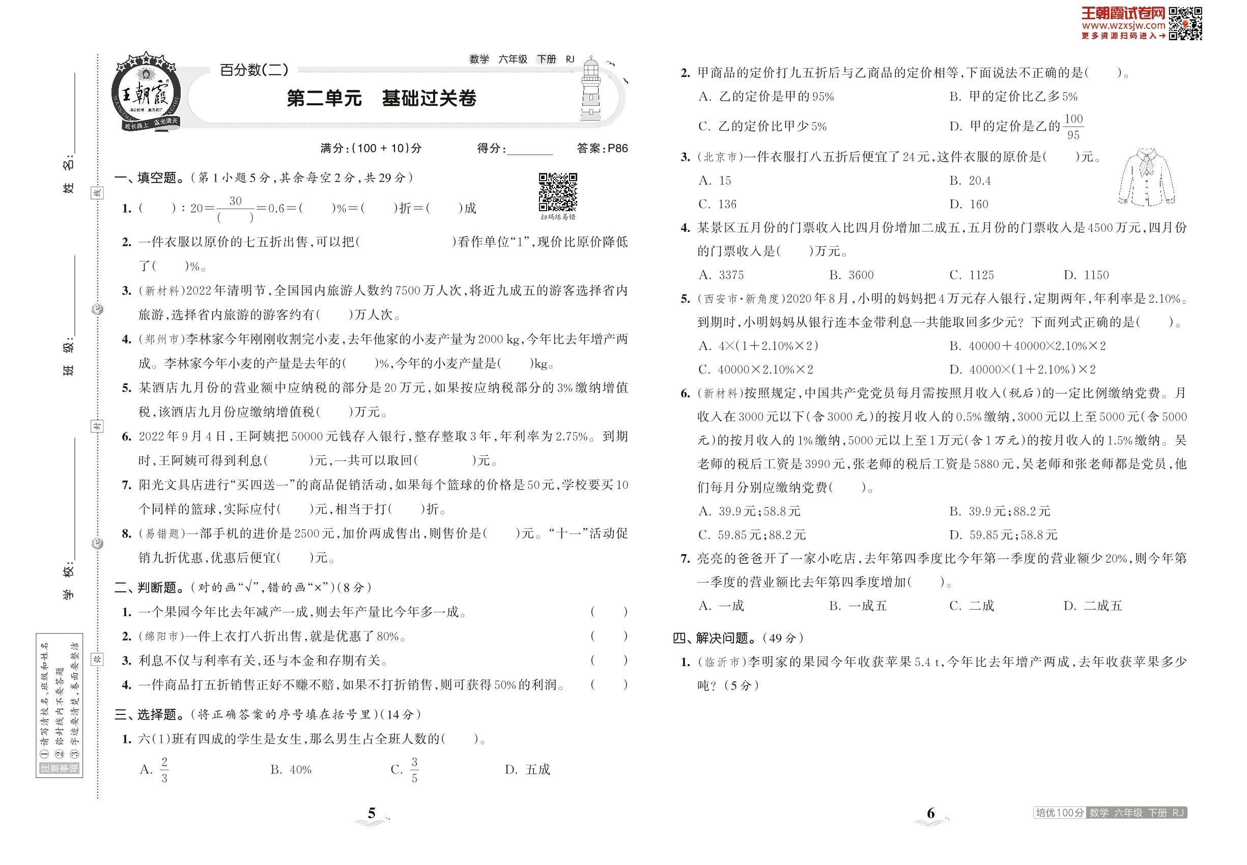 2023下册六年级数学人教版 第二单元 基础过关卷