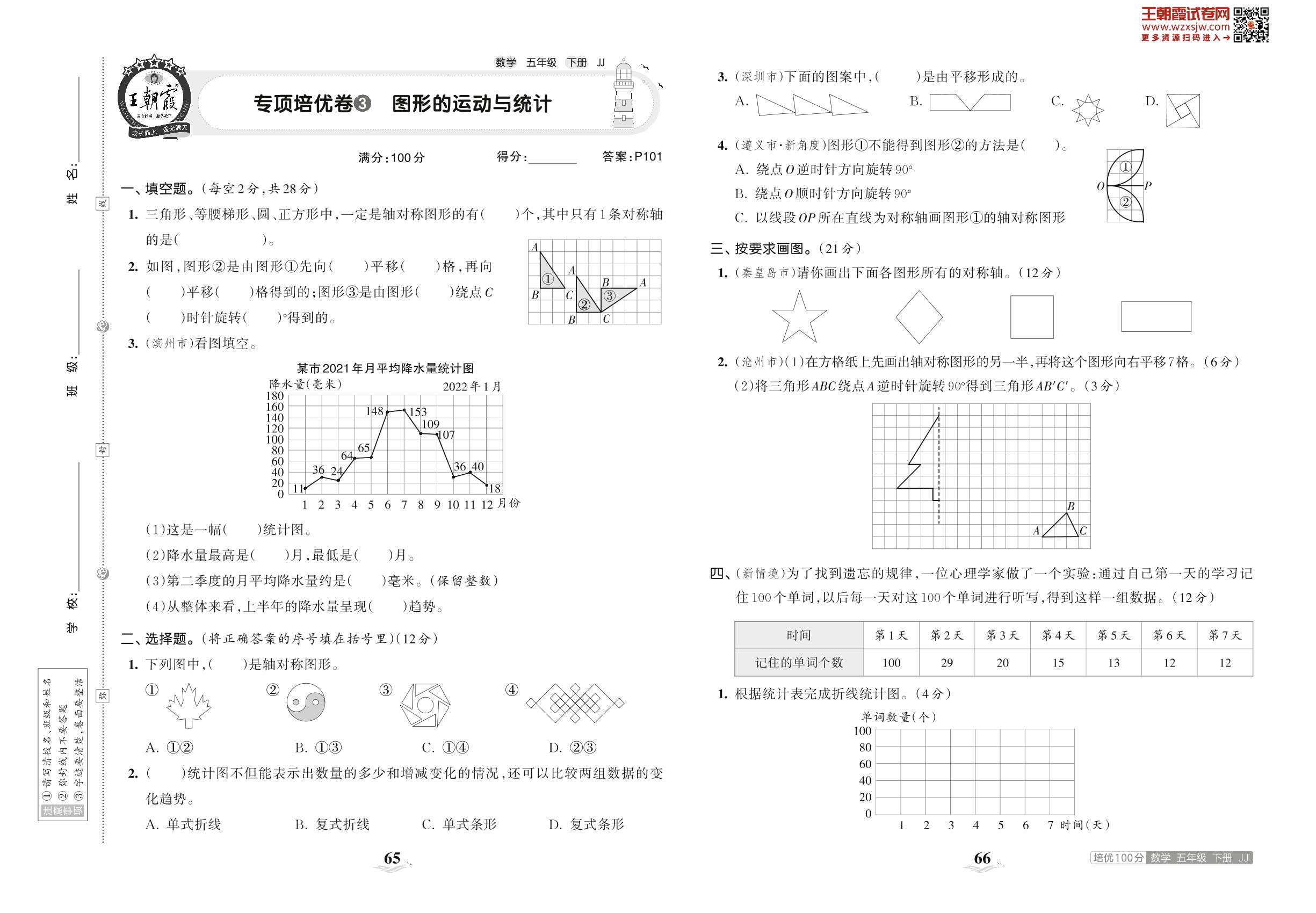2023下册五年级数学冀教版 专项培优卷3 图形的运动与统计