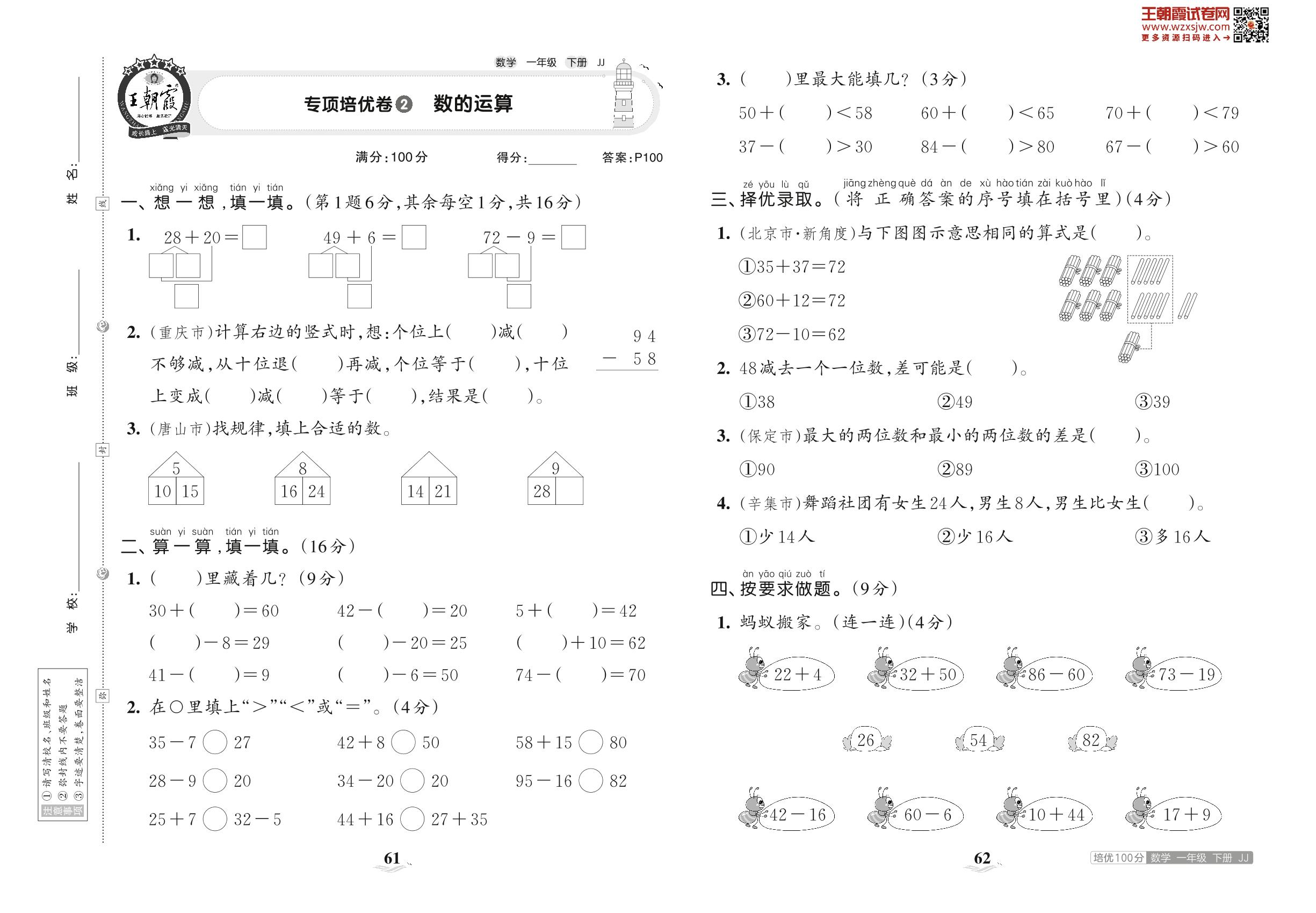 一年级数学冀教版下册专项卷