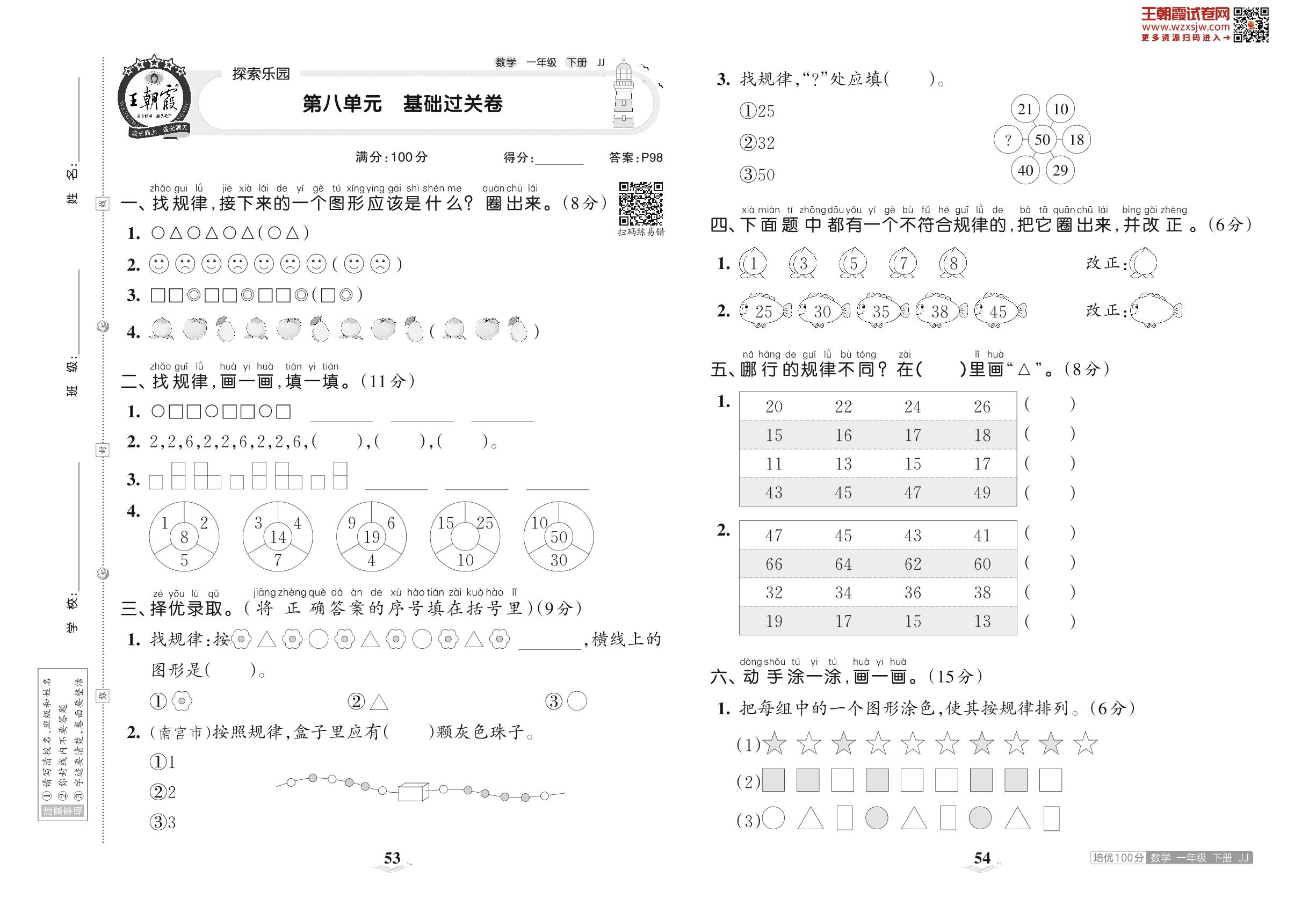 2023下册一年级数学冀教版 第八单元 基础过关卷