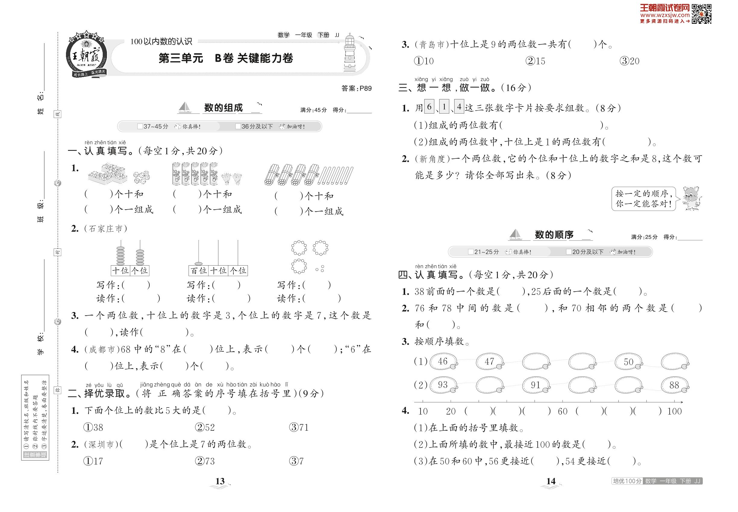 2023下册一年级数学冀教版 第三单元 B卷 关键能力卷