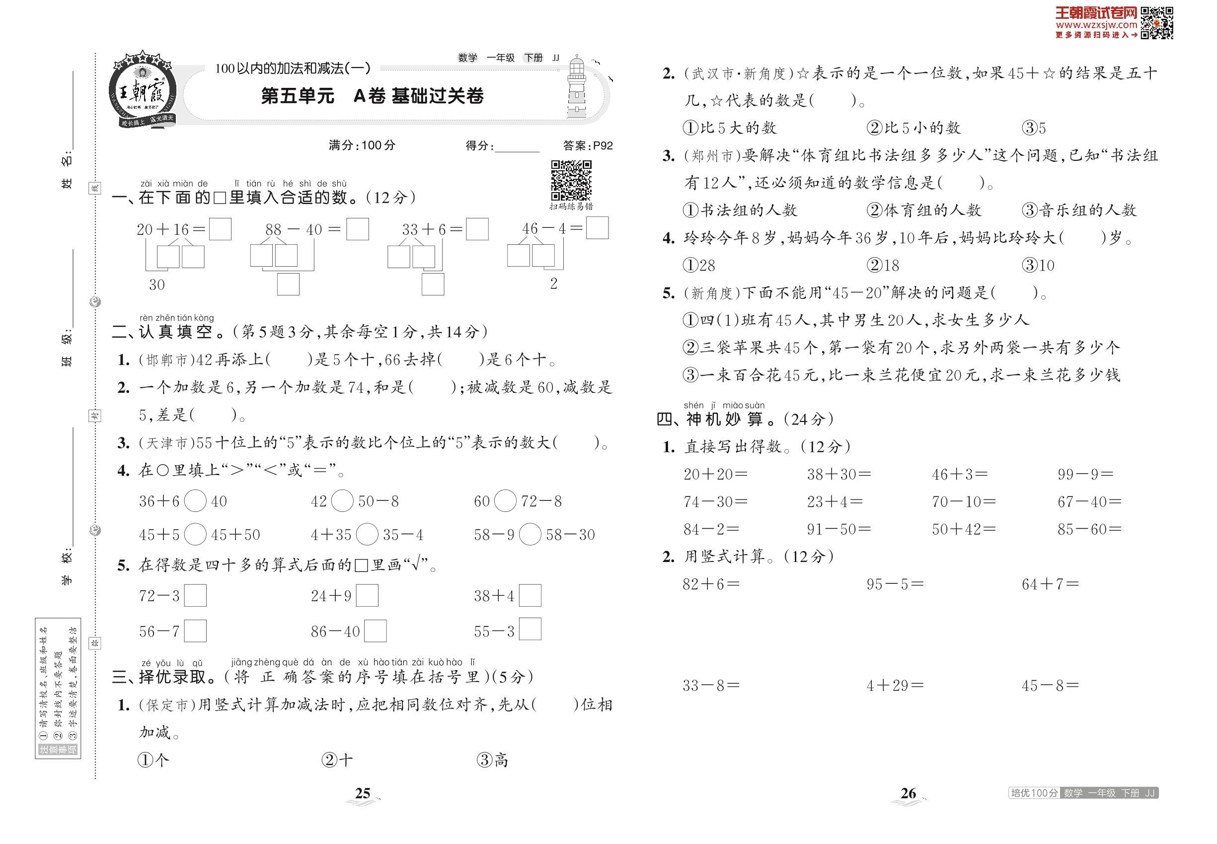 2023下册一年级数学冀教版 第五单元 A卷 基础过关卷