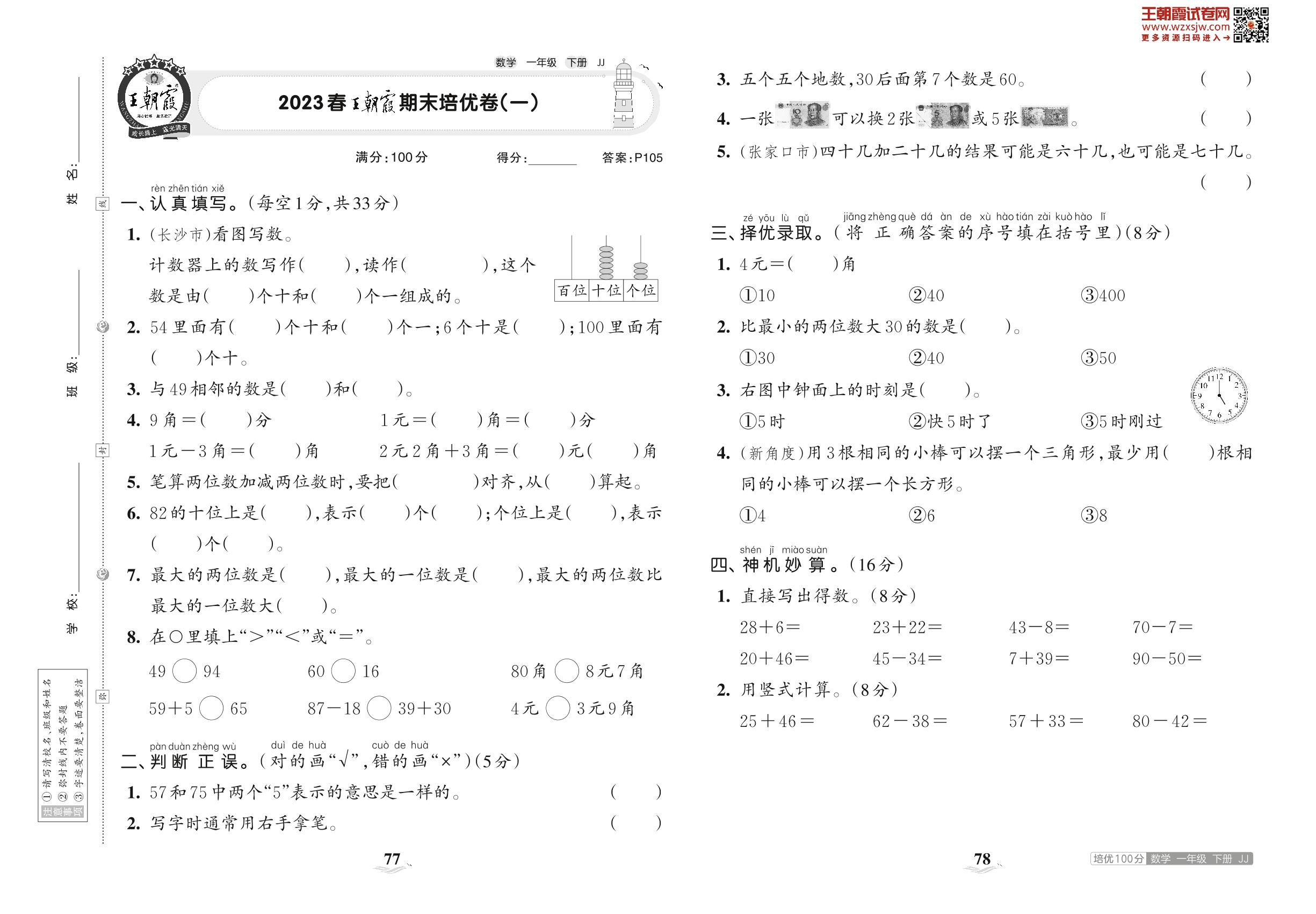 2023下册一年级数学冀教版 2023春王朝霞期末培优卷(一)