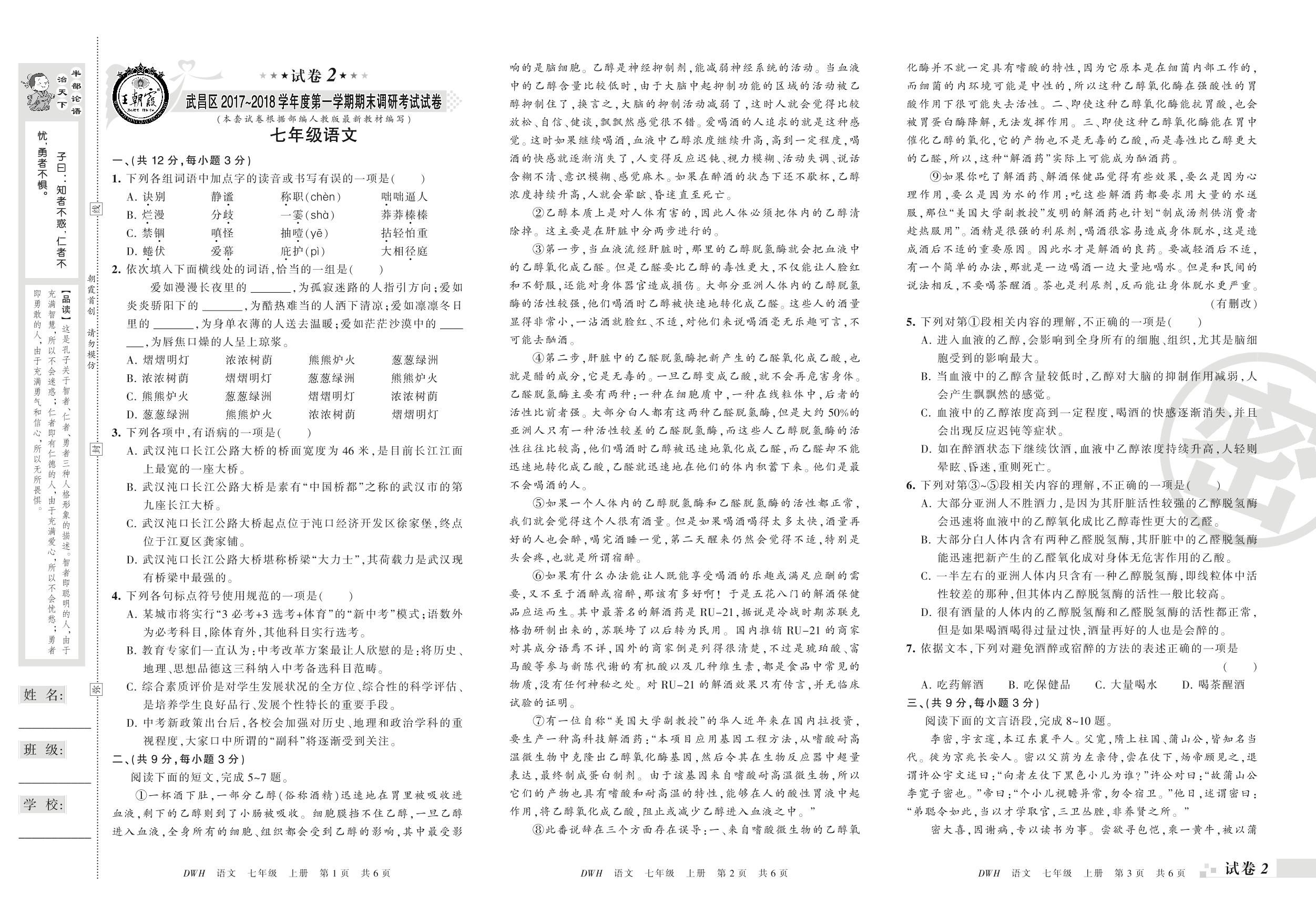 2017-2018学年第一学期武汉市武昌区七年级语文试卷(人教版)【2】