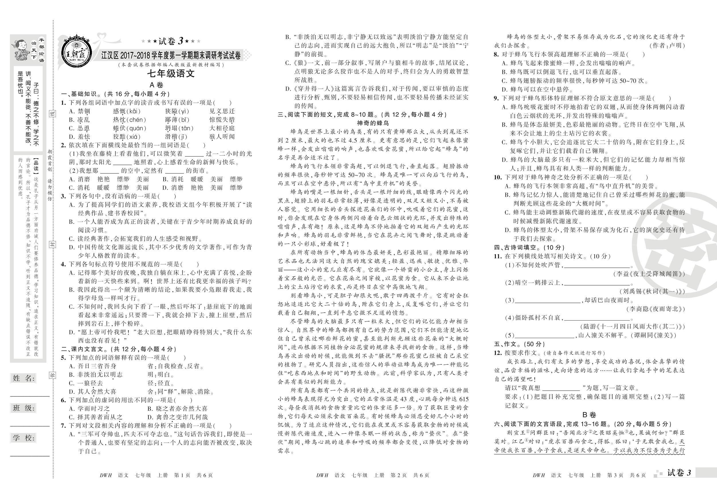 2017-2018学年第一学期武汉市江汉区七年级语文试卷(人教版)【3】