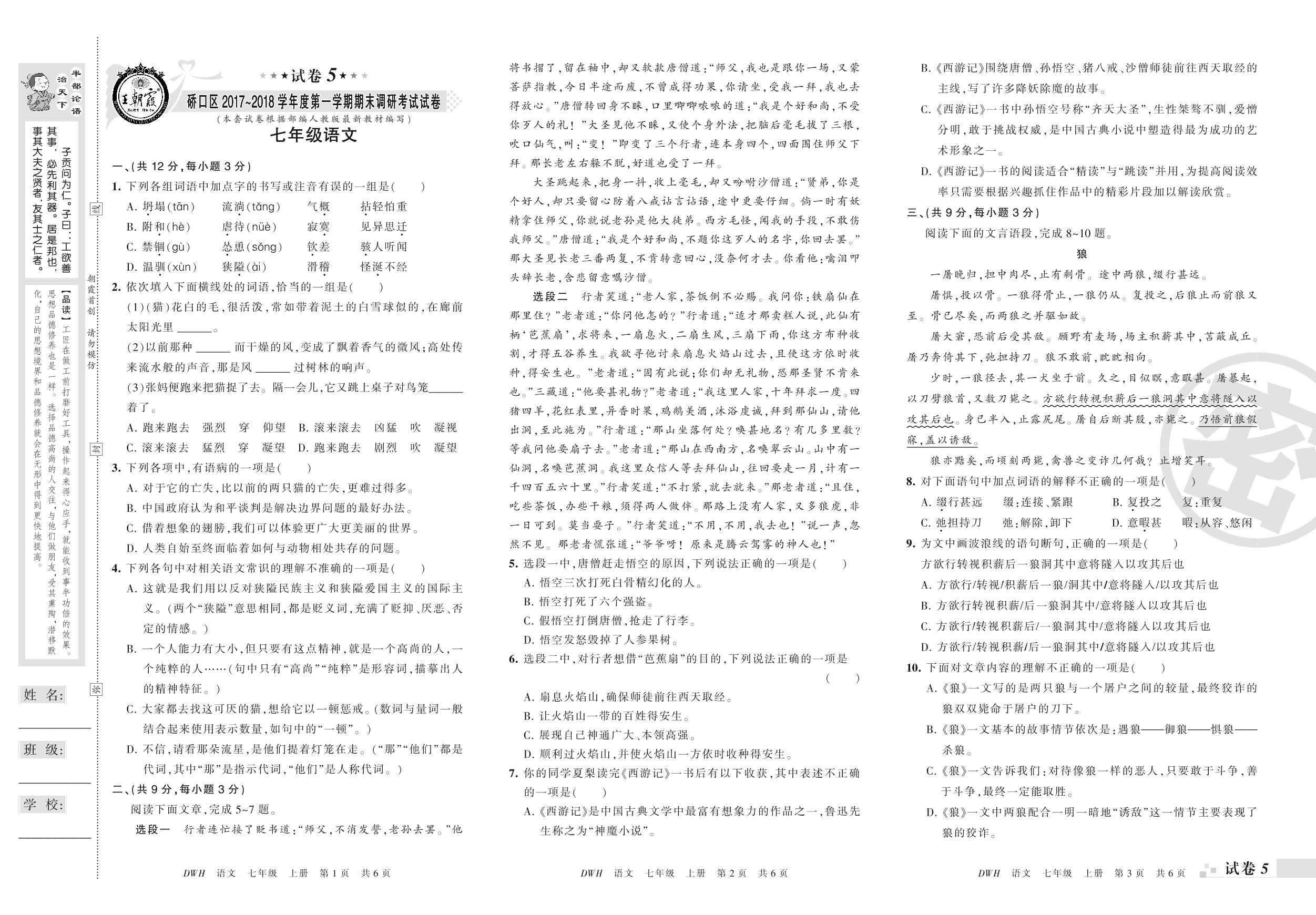 2017-2018学年第一学期武汉市硚口区七年级语文试卷(人教版)【5】