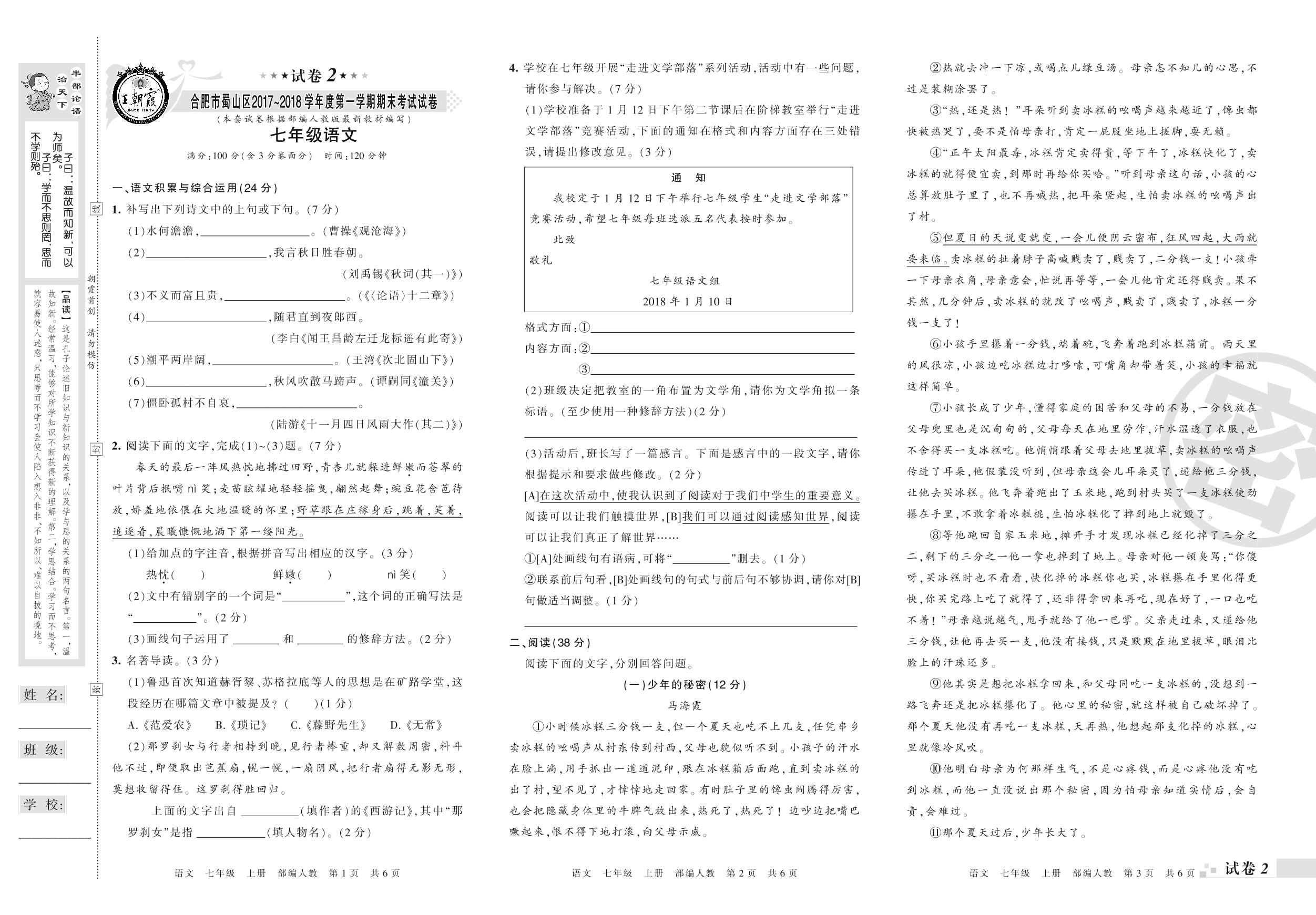 2017-2018学年第一学期合肥市蜀山区七年级语文试卷(人教版)【2】