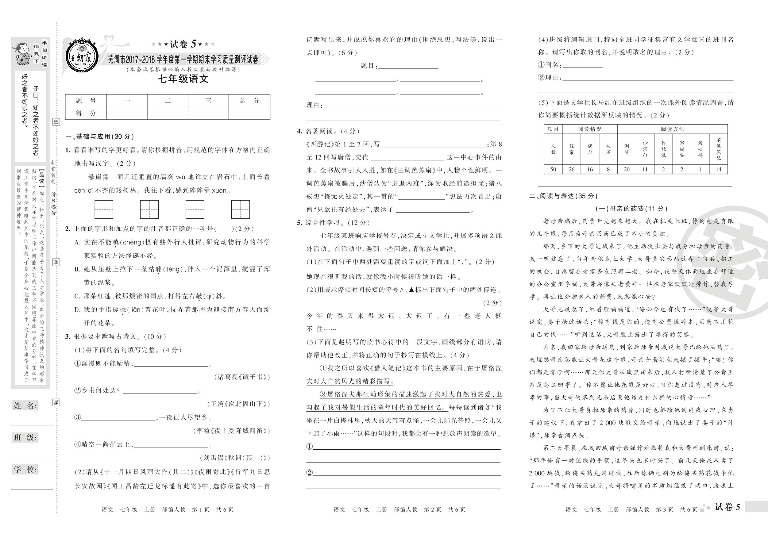 2017-2018学年第一学期芜湖市七年级语文试卷(人教版)【5】